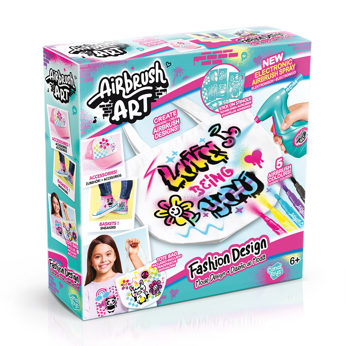 Dekorieren Sie Ihre Kleidung und textile Accessoires mit diesem Airbrush Art Kit! Stecken Sie einen Filzstift in das elektronische Spray und sprühen Sie auf die mitgelieferte Tragetasche. Kreieren Sie einzigartige grafische Effekte mit den Schablonen und Markern! Inhalt:1 Sprühgerät für Airbrush Art, 6 Filzstifte, 3 Schablonenblätter zum Aufkleben, 1 Tragetasche, 1 Anleitungsblatt