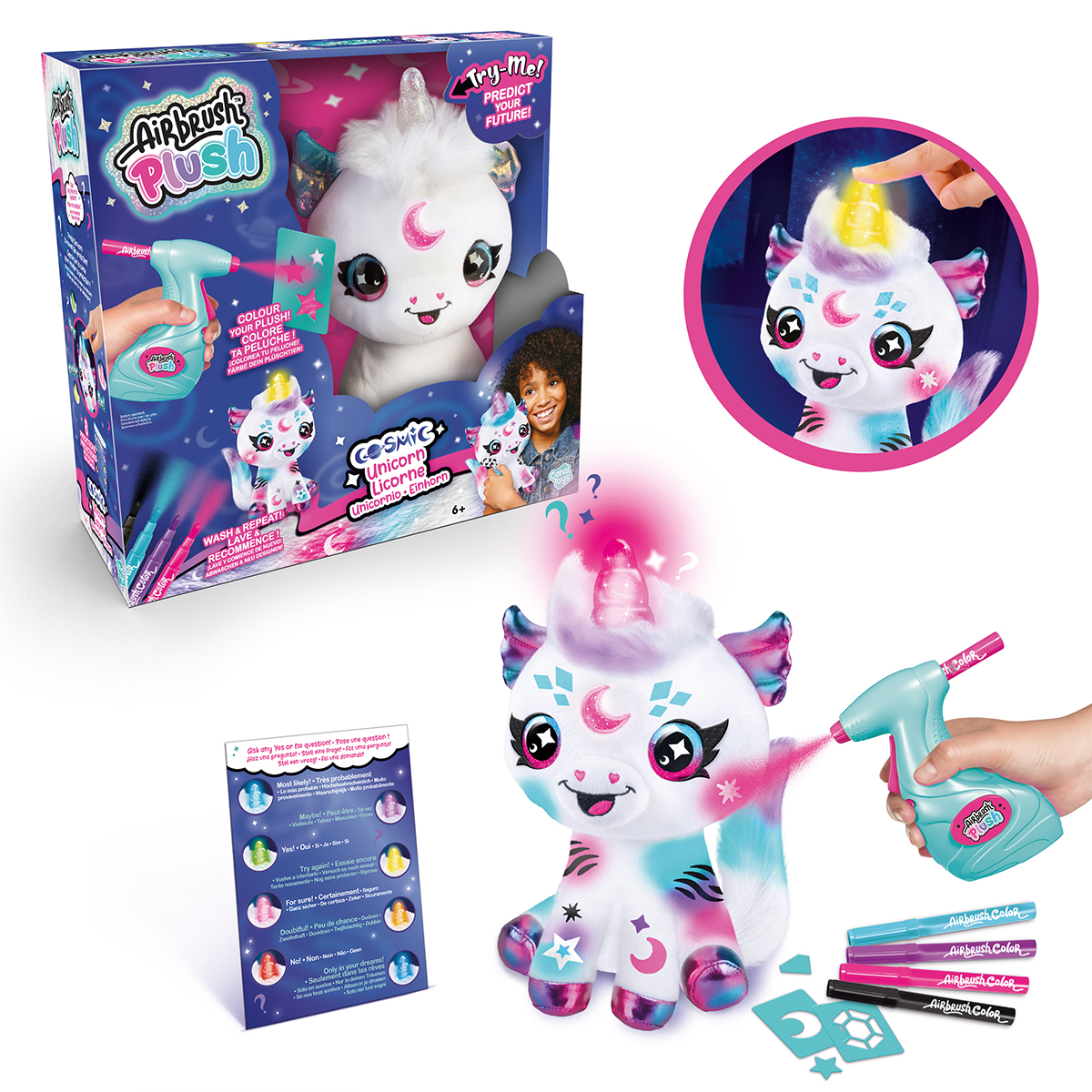 Personalisiere deinen Plüsch mit deinem Spray, deinen Markern und deinen Schablonen. Wasche deinen Plüsch und mach es noch einmal! Stelle deinem kosmischen Einhorn eine Frage und drücke auf sein Horn: es leuchtet auf! Entschlüssle die Antwort auf deine Frage mit dem Wahrsagung Leitfaden!