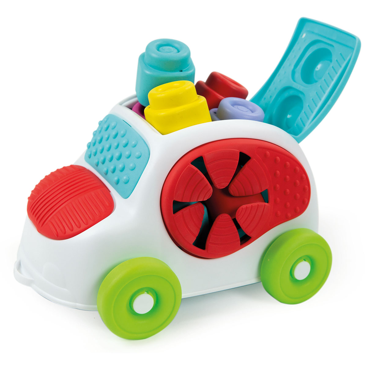 Clemmy - innovatives Auto mit weichen Einsätzen wie den Clemmy-Blöcke, ein anregendes Erlebnis, das Spiel und sensorische Entdeckung miteinander verbindet. Die weichen Einsätze können erkundet und berührt werden, um die verschiedenen Reliefmuster und -formen zu entdecken. Stimuliert den Tastsinn und manuelle Fähigkeiten. Das Dach des Autos kann als Unterlage für das Stapeln der Clemmy-Blöcke verwendet werden. Es öffnet sich und wird zu einem praktischen Fach für die Aufbewahrung der Bausteine. Die weichen Seitenfenster ermöglichen das Spielen und Einsetzen der Blöcke in das Auto sowie das wieder Herausnehmen. Sowohl das Auto als auch die Blöcke können auch in der Spülmaschine gewaschen werden.