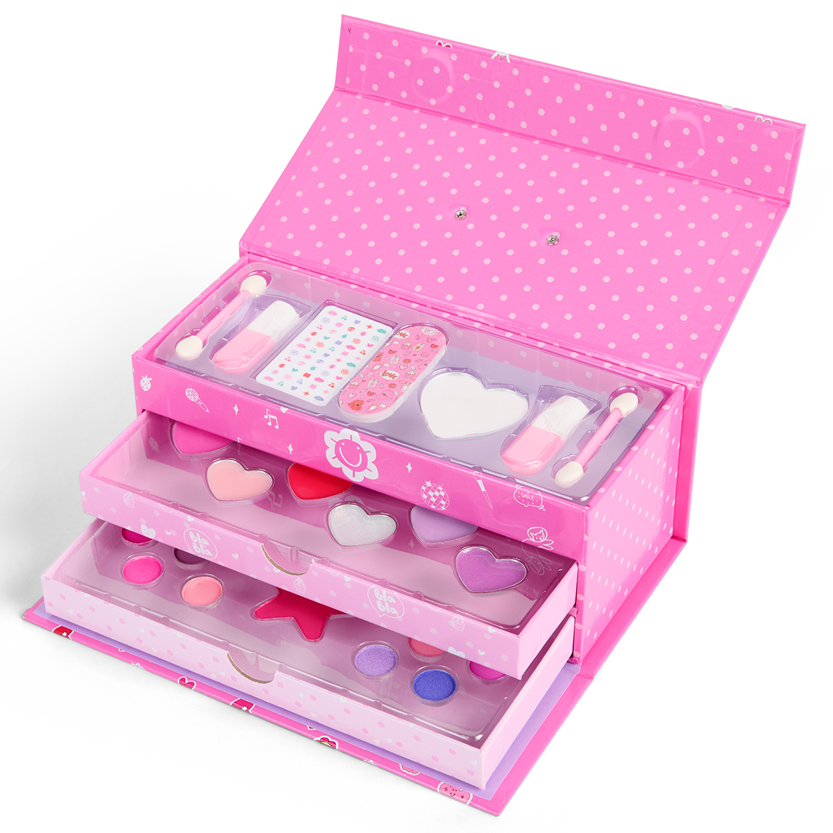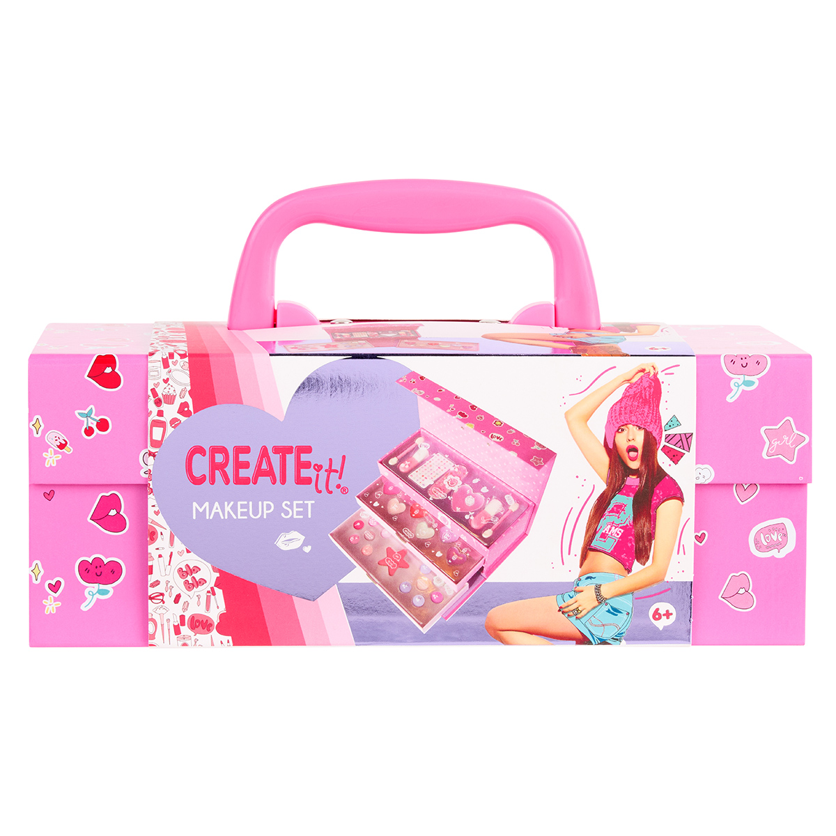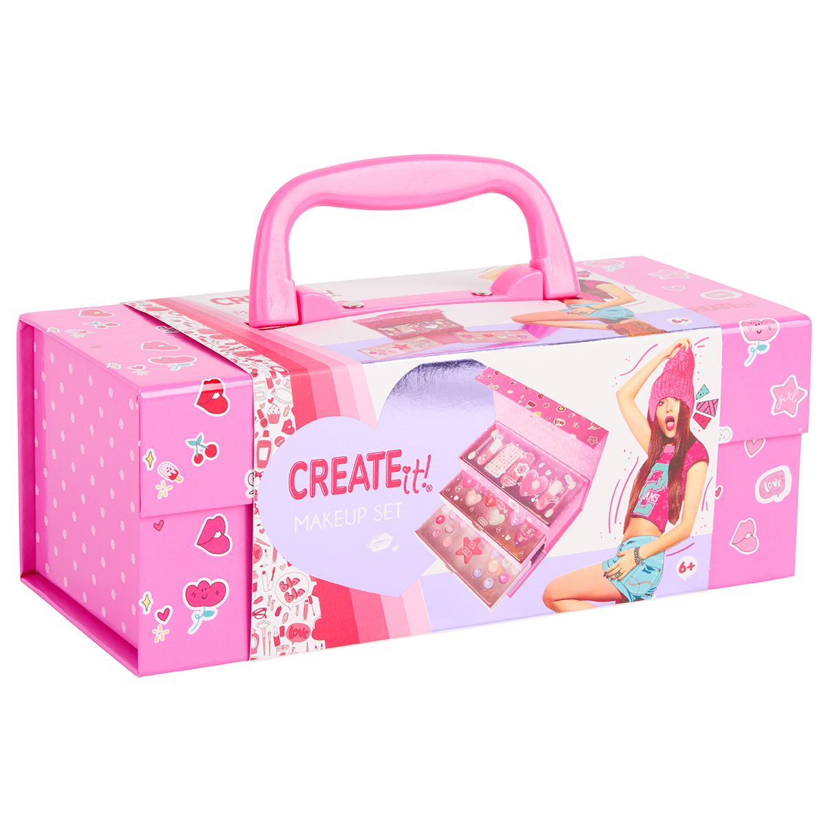 Create it! Beauty-Case gefüllt mit Schwämme, Bürsten, Nagelfeile, Spiegel, Nagelsticker, Lidschatten, Rouge, Lippenbalsam.