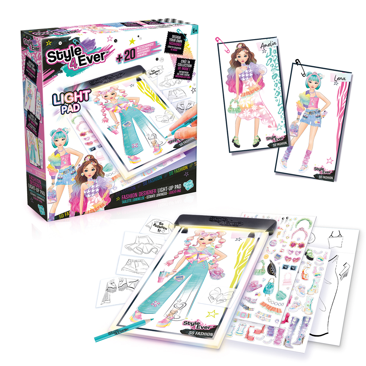 Zeigen Sie Ihr Styling-Talent und erstellen Sie Ihre Kollektion mit diesem Fashion Light-up Pad! Kreieren Sie neue Outfit-Kombinationen mit den Schablonen, beleuchten Sie Ihre Modestile! Mit dem mitgelieferten Zubehör kannst du ganz einfach viele Outfits kreieren.