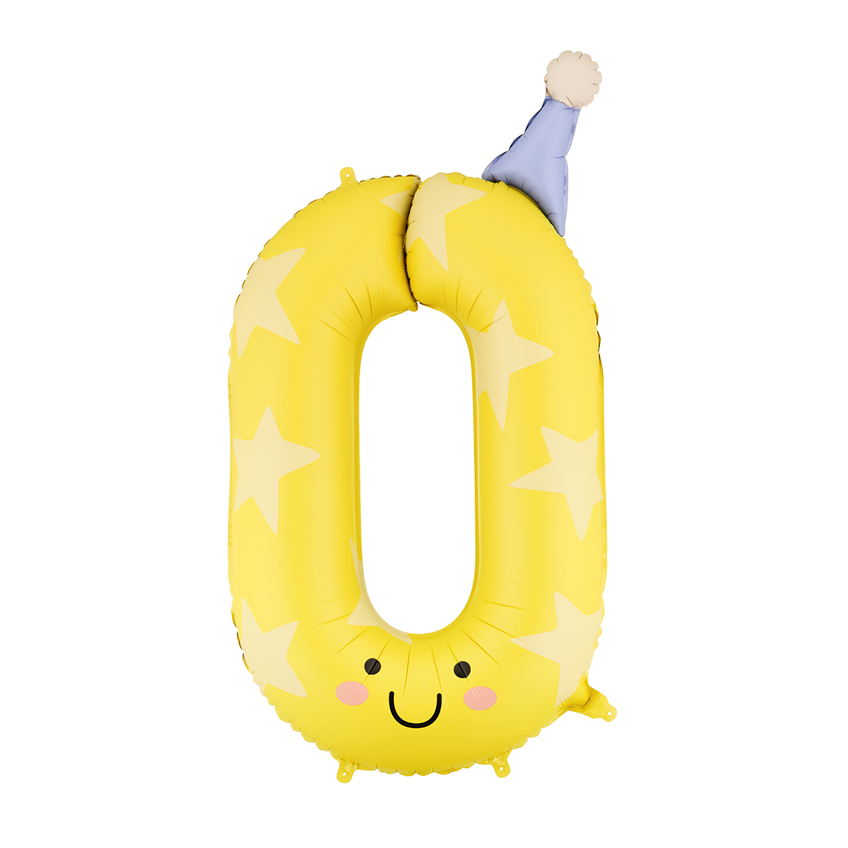 Mattierter Folienballon Zahl 0 in Gelb mit bunter Mütze. Grösse vor dem Aufblasen ca. 95 cm, Grösse nach dem Aufblasen ca. 86 cm. Zum Befüllen mit Luft und Helium. Set enthält einen Trinkhalm.