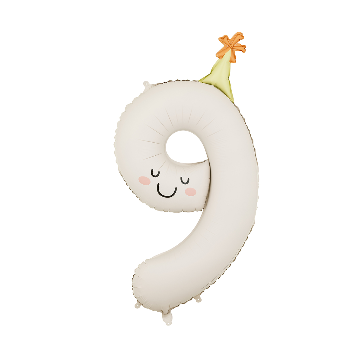 Mattierter Folienballon Zahl 9 in creme mit bunter Mütze. Grösse vor dem Aufblasen ca. 95 cm, Grösse nach dem Aufblasen ca. 86 cm. Zum Befüllen mit Luft und Helium. Set enthält einen Trinkhalm.