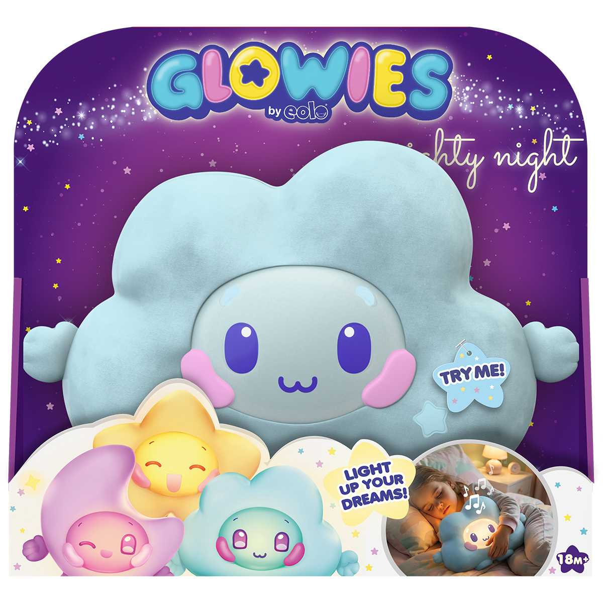 Glowies Nachtlicht aus Plüsch mit Sound. Drücke den Knopf, um 3 verschiedene Lieder und Lichteffekte zu entdecken. Mit einem 15-Minuten-Timer, nach Ablauf dieser Zeit schaltet sich das Plüschtier automatisch aus.