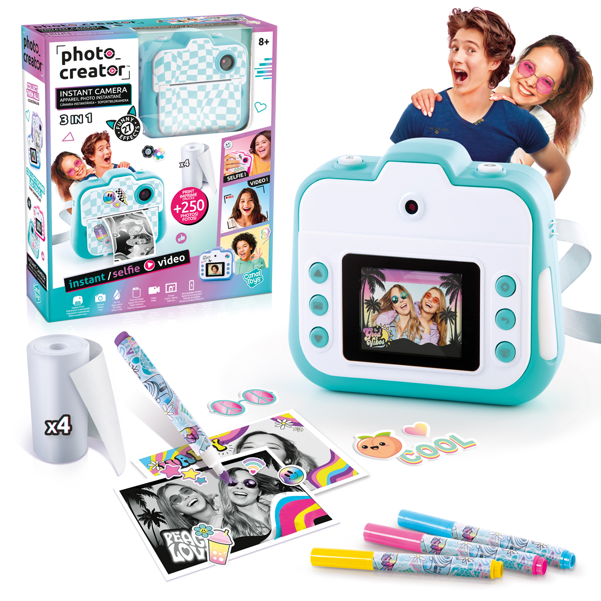 Mit dieser Kamera kannst du stundenlang Spaß haben und kreativ werden. Nimm deine Videos oder Fotos auf. Füge lustige Effekte hinzu und drucke die Fotos sofort aus! Du kannst mit Markern und Aufklebern individuell gestalten! Drucke über 250 Fotos. 4 Farben zum Sammeln! Inhalt : 1 Kamera, 1 USB-Kabel, 1 Handschlaufe, 4 Papierrollen, 1 Aufkleberbogen, 2 Kameradekorationen, Aufkleberbogen, 4 Marker, 1 Handbuch