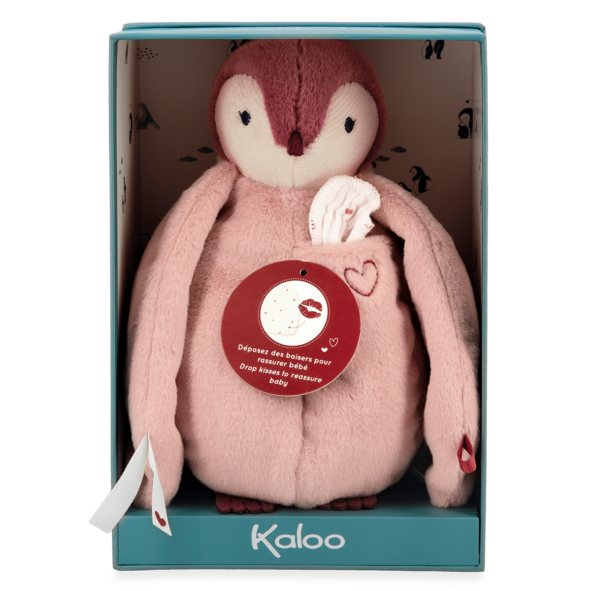 Dieser weiche rosa Pinguin mit einer Grösse von 20 cm ist immer bereit, Ihr Baby zu trösten, wenn Sie einmal nicht bei ihm sein können. Aus extra weichem Fell mit einer Tasche auf seinem Herzen, die ein langes Tuch aus Baumwollmusselin enthält, das den Geruch der Eltern annimmt oder auf dem sie Küsse hinterlassen können. Sie können das Plüschtier an ihrem Körper tragen, damit ihr Geruch daran haften bleibt und Baby Trost spenden kann, wenn es das Tuch in der Hand hält. Die Flügel des Pinguins können mithilfe von Bändern zusammengebunden werden. Diese Bänder sind mit einem schönen Herzen verziert und symbolisieren Schutz und Bindung. Es ist in einer hübschen Geschenkschachtel verpackt, die individuell gestaltet werden kann und als Aufbewahrungsetui wiederverwendet werden kann. Bei 30 °C in der Maschine waschbar. Füllung aus recyceltem Polyester. Ab Geburt.