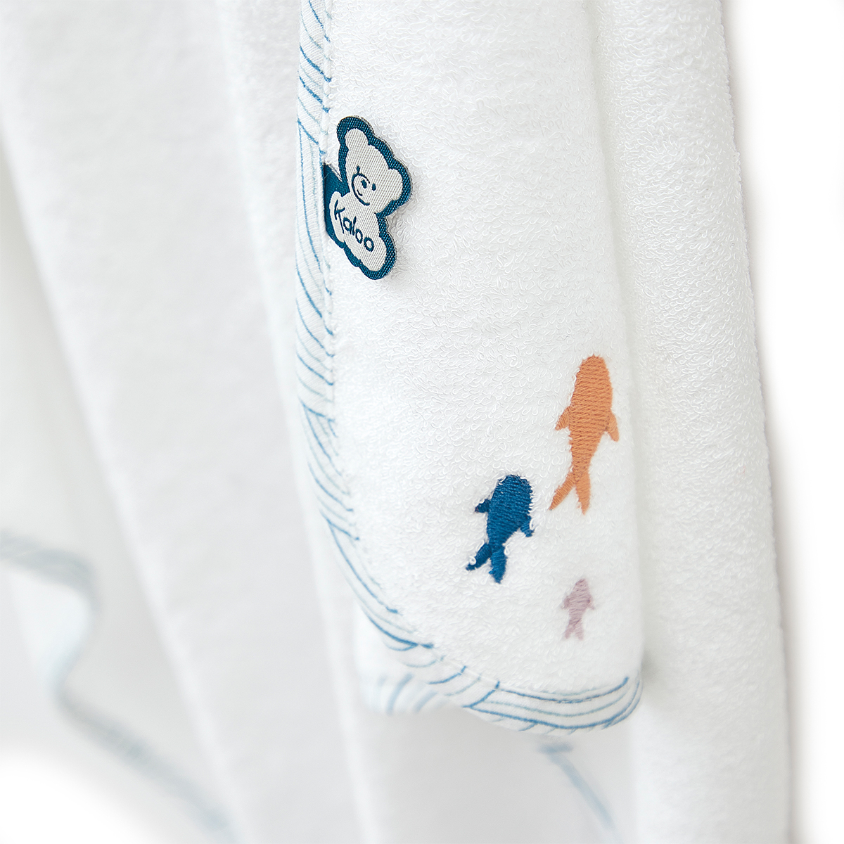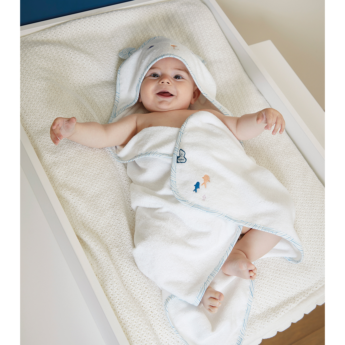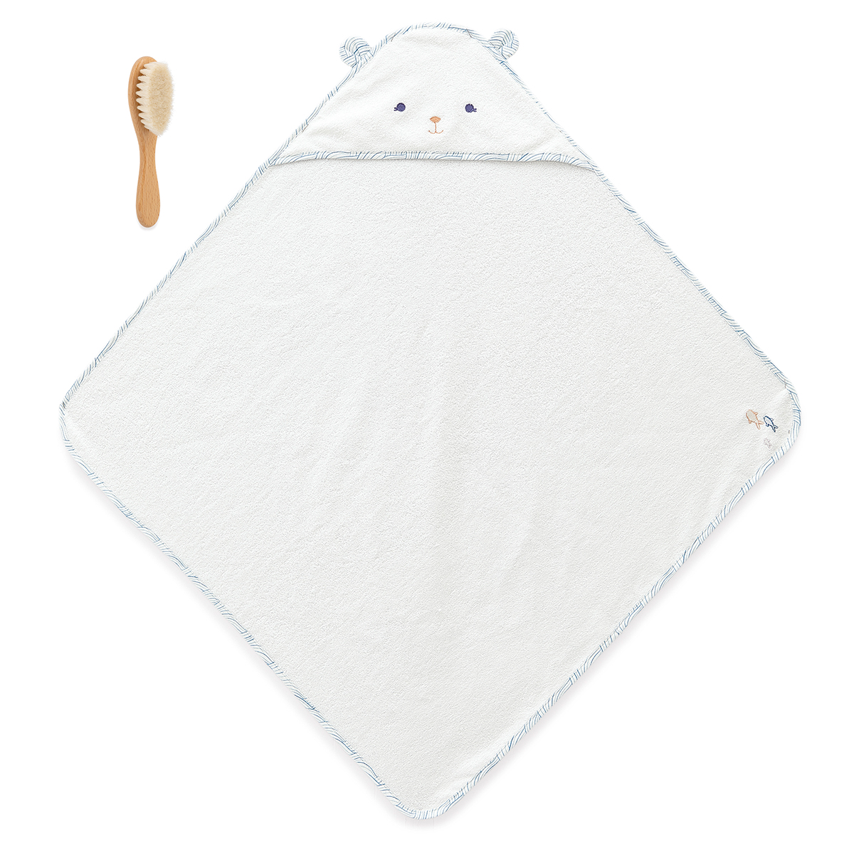 Ein entzückendes Badeset, das speziell für das Wohlbefinden des Babys entwickelt wurde. Es umfasst ein 75 cm grosses Babybadetuch aus Bambus (Grammatur 500 g) mit einem Bärenkopf und einer Haarbürste. Das Bambusmaterial wurde speziell wegen seiner antibakteriellen und saugfähigen Eigenschaften ausgewählt, während es gleichzeitig sehr weich ist. Verschiedene Details veredeln das Babybadetuch: Wellenmuster am Rand und hübsche gestickte Fische auf der Rückseite. Perfekt für Babys erstes Bad und um es warmzuhalten. Die weiche Massagebürste aus Buchenholz und Ziegenhaar vervollständigt dieses Set, um das Baby in ruhigen Momenten zu entspannen. Kleine Fische, die das Muster des Badetuchs aufgreifen, wurden per Siebdruck auf die Bürste gedruckt. Stoff bei 30 °C in der Maschine waschbar. Ab Geburt.