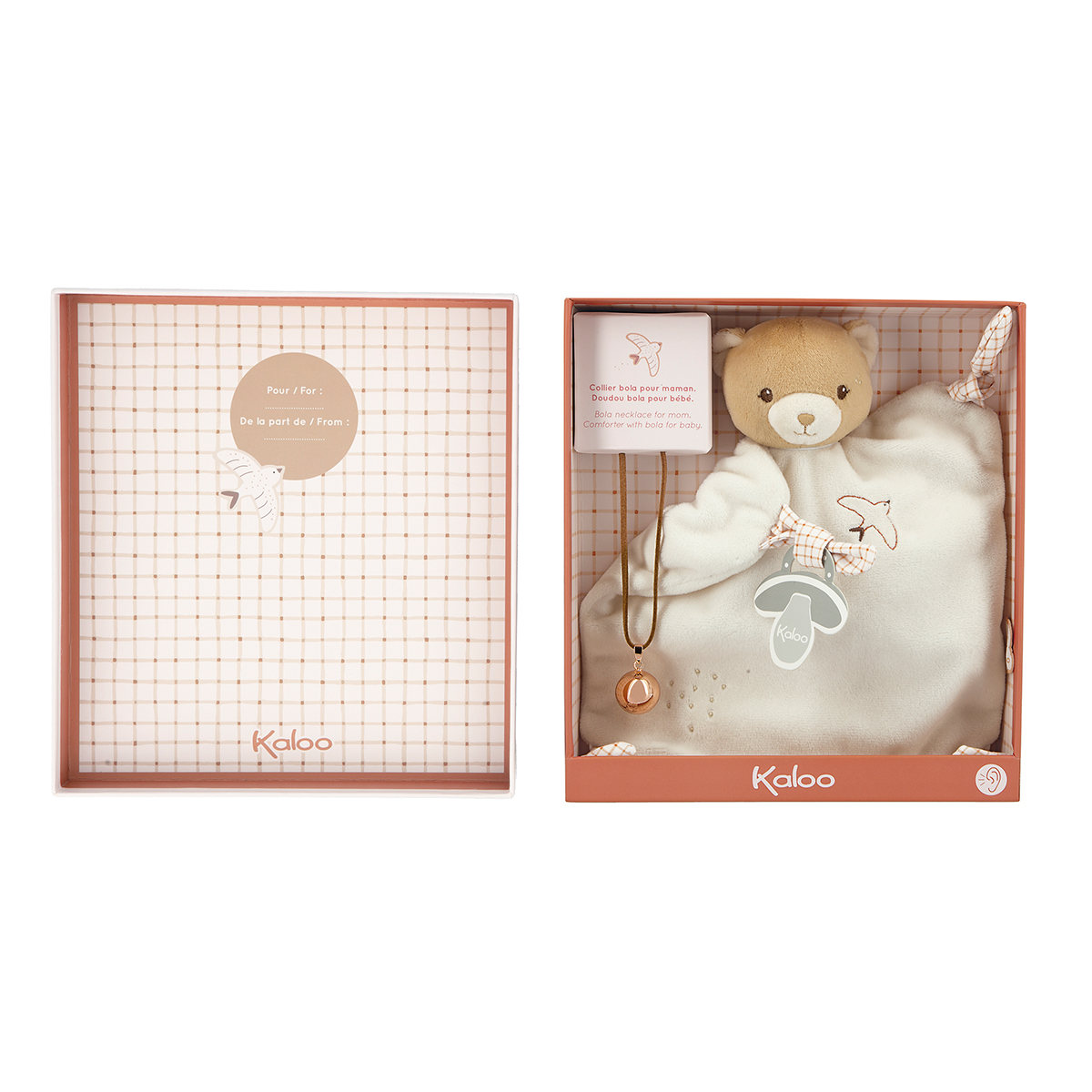 Das ideale Geschenkset zur Geburt bereits ab der Schwangerschaft. Das Set besteht aus einer wunderschönen Bola-Halskette aus Messing für die Mutter und einem 24 cm grosses Bärchen-Schmusetuch, dessen Kopf ebenfalls eine Bola für das Baby enthält. Die Bola ist ein Schmuckstück, das Ruf der Engel genannt wird. Sie soll Mutter und Kind schützen und durch ihr sanftes Läuten Frieden und Harmonie bringen. Der kristallklare Klang der Bola, die über den runden Bauch der Mutter rollt, tröstet das Baby von den ersten Augenblicken im Uterus. Nach der Geburt wird das Bärchen-Schmusetuch denselben Klang erzeugen, um das Baby zu beruhigen und in einen Kokon der Zärtlichkeit zu hüllen. Diese sanfte, erste Begegnung mit Musik schafft eine Umgebung, in der sich das Baby sicher fühlt, und fördert seine Aufmerksamkeit und Neugierde. Eine hübsche gestickte Schwalbe schmückt den weichen Microvelours-Bauch des Bären. Bei der Auswahl der Materialien für das Schmusetuch haben wir darauf geachtet, dass mindestens 75 % des Materials recycelt ist. Die Produkte können bei 30 °C in der Maschine gewaschen werden und sind in einer hübschen Geschenkschachtel verpackt, die unter ihrem Deckel Platz für ein paar persönliche Worte bietet und als Aufbewahrungsbox wiederverwendet werden kann.