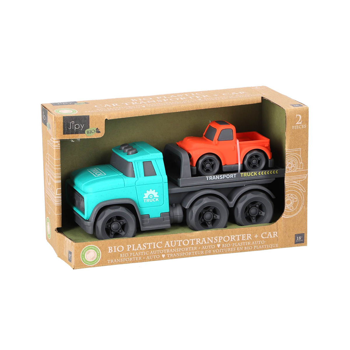 Kleiner biobasierter Transporter mit Ladeklappe und einem Zusatzauto, ideal für Transport- und Rennspiel.