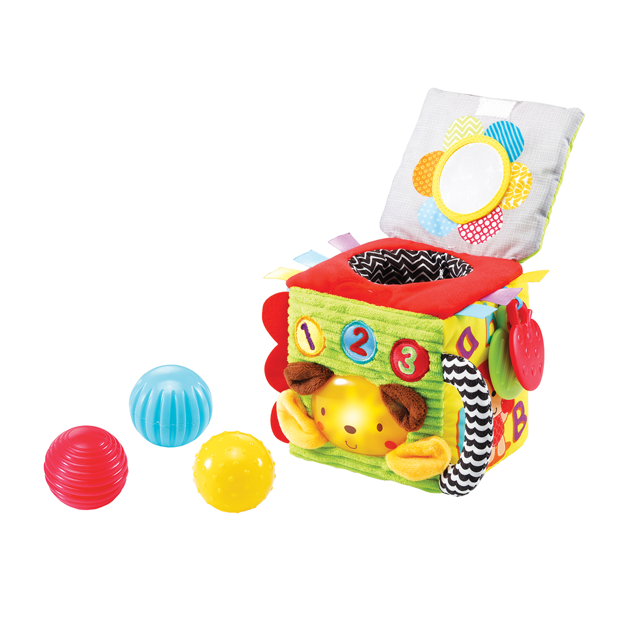 6 Seiten voller Spiel, Spass und Abenteuer! Würfel mit 6 Seiten voller unterschiedlicher Gegenstände, zum Entdecken, Lernen und Spielen. Verschiedene Oberflächen regen den Tastsinn an, aufleuchtender Welpe singt, spricht und spielt tolle Melodien. Reagiert auf Bewegungen mit lustigen Geräuschen. 3 Weiche Bälle, zum Einwerfen in den Würfel. 3 gesungene Lieder, 15 Kindermelodien. Lautstärkeregler, kindersicheres Batteriefach und Abschaltautomatik.