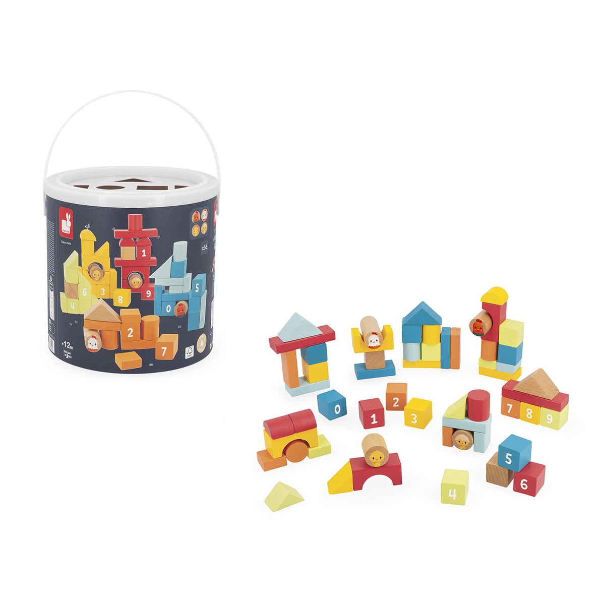 Empiler, construire, imaginer. voici un baril de 56 pièces multicolores, sur le thème de la ferme, pour développer la motricité fine de votre enfant. Doté d'un couvercle avec la découpe des pièces, il devient une boite à formes pour tout ranger dans le baril tout en s'amusant. Enfin, votre enfant y trouvera des ronds, des carrés, des triangles, mais aussi des ponts et des illustrations (poule, coq et poussins) pour développer son imagination. La numérotation des cubes de 0 à 9 permettra aux plus grands d'apprendre à compter. Jouet en bois FSCTM. Jouet d'éveil pour les enfants à partir de 12 mois.