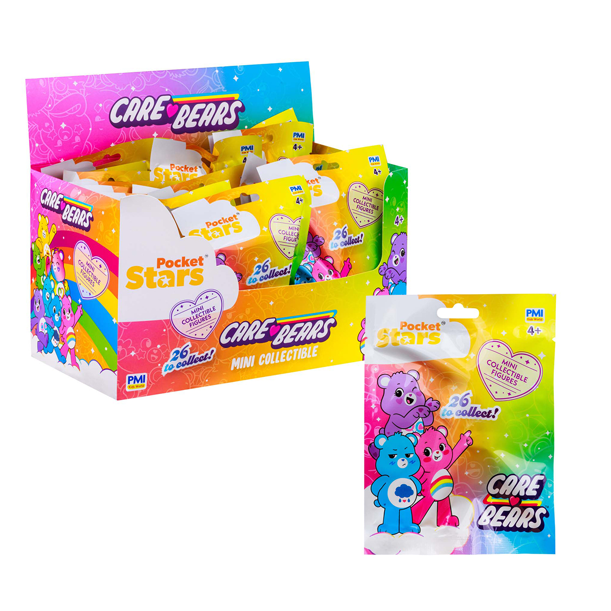 Display avec 24 figurines Care Bears de 5 cm - 26 modèles à collectionner. Chaque sachet contient une figurine à collectionner et un dépliant en 4 couleurs. Figurines floquées, figurines avec accessoires et motifs électrolytiques.