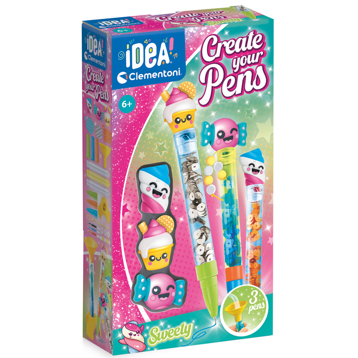 Crée tes stylos - Sweet. Un coffret créatif original qui permet d’assembler 3 stylos et de les personnaliser avec différentes décorations dans un style tropical. Le coffret contient 3 stylos à assembler, 3 encres de couleurs différentes, 3 personnages et tous les accessoires pour les décorer. Ce jeu permet de créer et de personnaliser ses stylos avec plein d’accessoires et de décorations variées.