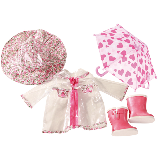 Beau Set pour la pluie, compose de imperméable, chapeau, parapluie et botte pour poupées 45 - 50 cm.