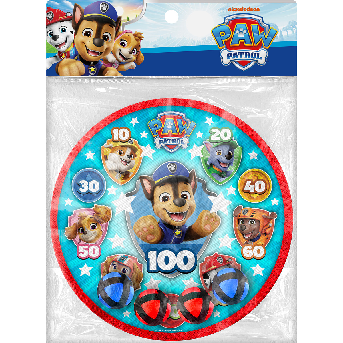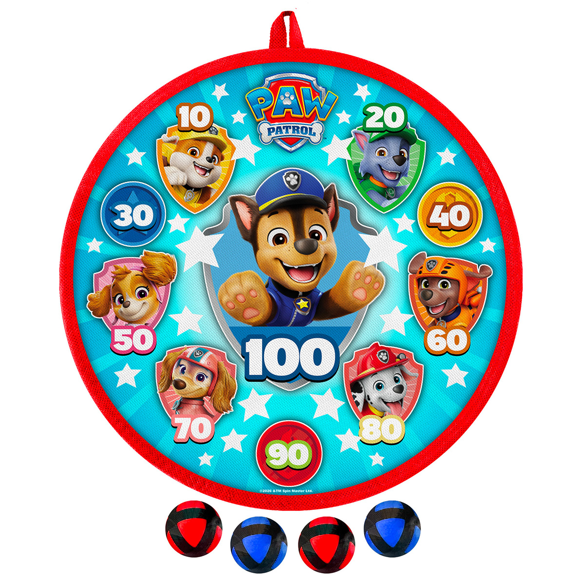 Des balles à velcro souples et une cible de 28 cm. Un jeu de fléchettes sûr pour les enfants – dans le style Pat’ Patrouille.