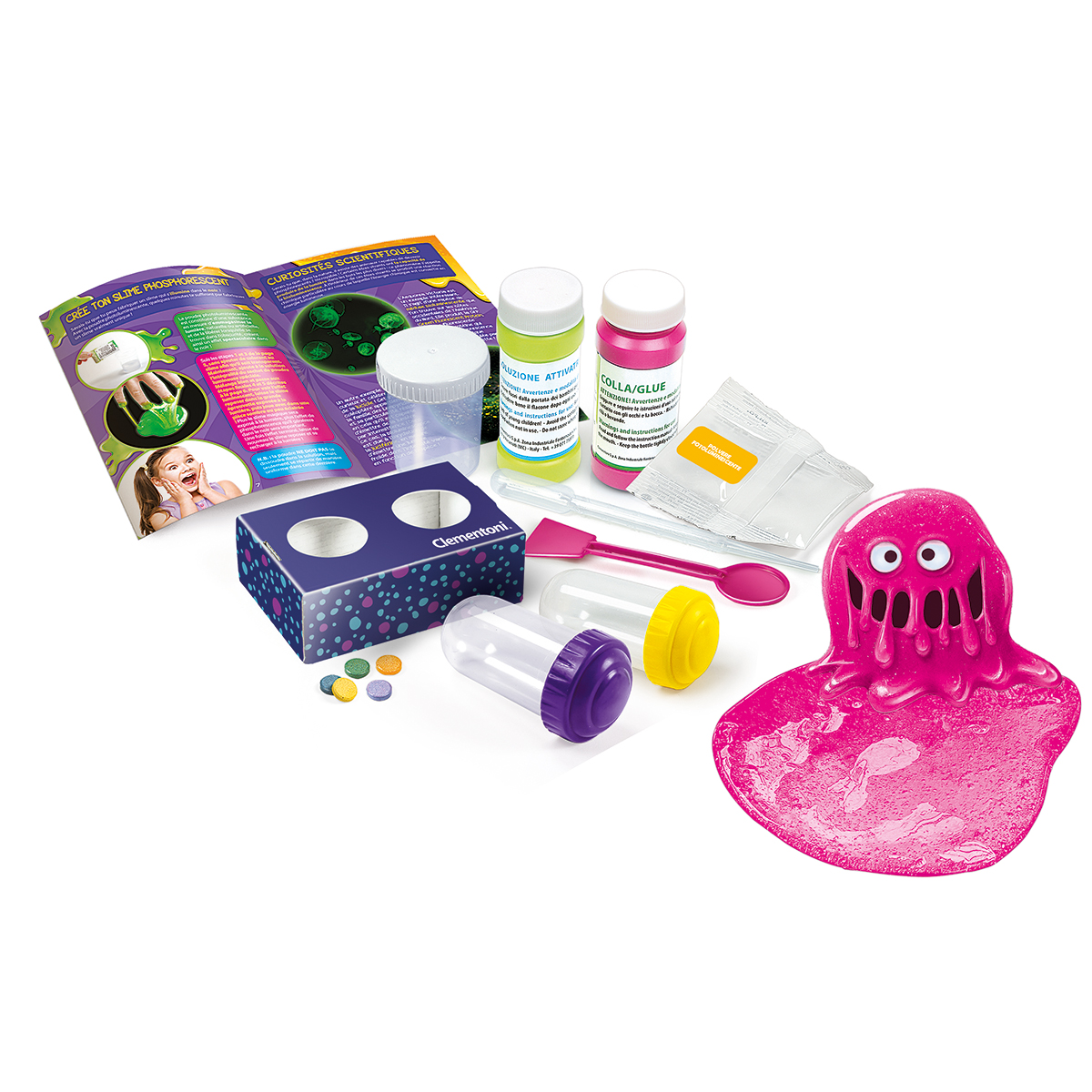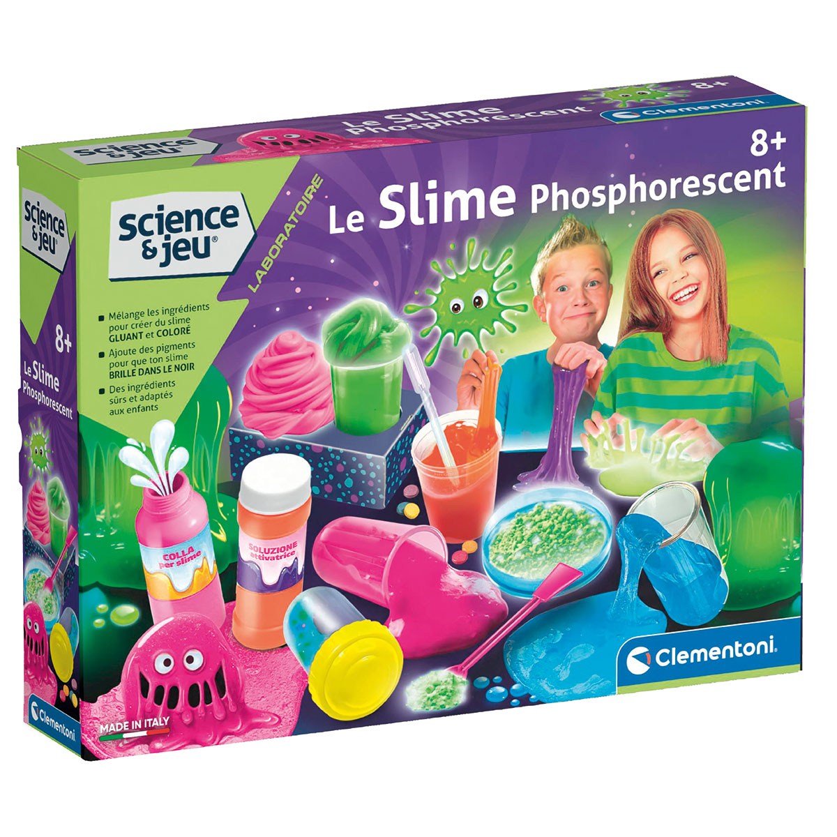 Le slime phosphorescent. Un incroyable laboratoire scientifique pour jouer avec la chimie et découvrir des fluides magqiues et surprenants qui s'illuminent dans l'obscurité. Un coffret avec tout le nécessaire pour réaliser des slimes et créer des fluides visqueux de manière amusante.