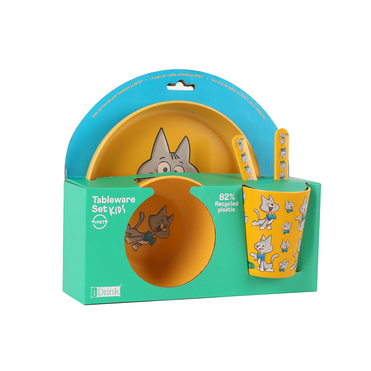 Nouveau set en rpet. Conçu pour les déjeuners des enfants, ce set comprend un verre de 200 ml, un bol de 280 ml, une assiette et des couverts (cuillère et fourchette), le tout fabriqué en plastique rpet recyclé.
