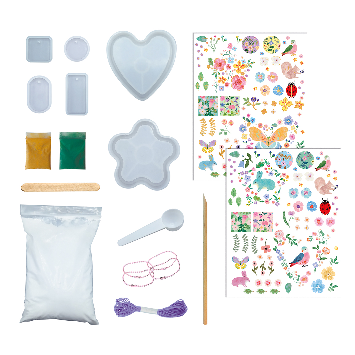 Créé tes propres décos fleuries ! Ce coffret créatif permet de réaliser 4 jolies coupelles et 12 porte-clés et décorations à suspendre en moulage à réaliser à l'aide d'une variété de plâtre au rendu lisse et mat et de jolies décalcomanies pour un résultat réussi garanti ! Ce coffret contient 300 g de poudre à mélanger avec de l'eau, 2 sachets de pigments en poudre (jaune et vert), 1 bâtonnet en bois, 1 cuillère doseuse, 2 grands moules en silicone d'environ 10 cm (fleur et cœur), 4 petits moules en silicone, 2 planches de décalcomanies (dont 1 avec de la dorure), 4 chaînettes avec fermoir, du fil coloré, et 1 livret avec les instructions et les modèles. Cette activité permet de développer sa patience et sa créativité. Elle est idéale pour les enfants à partir de 7 ans.