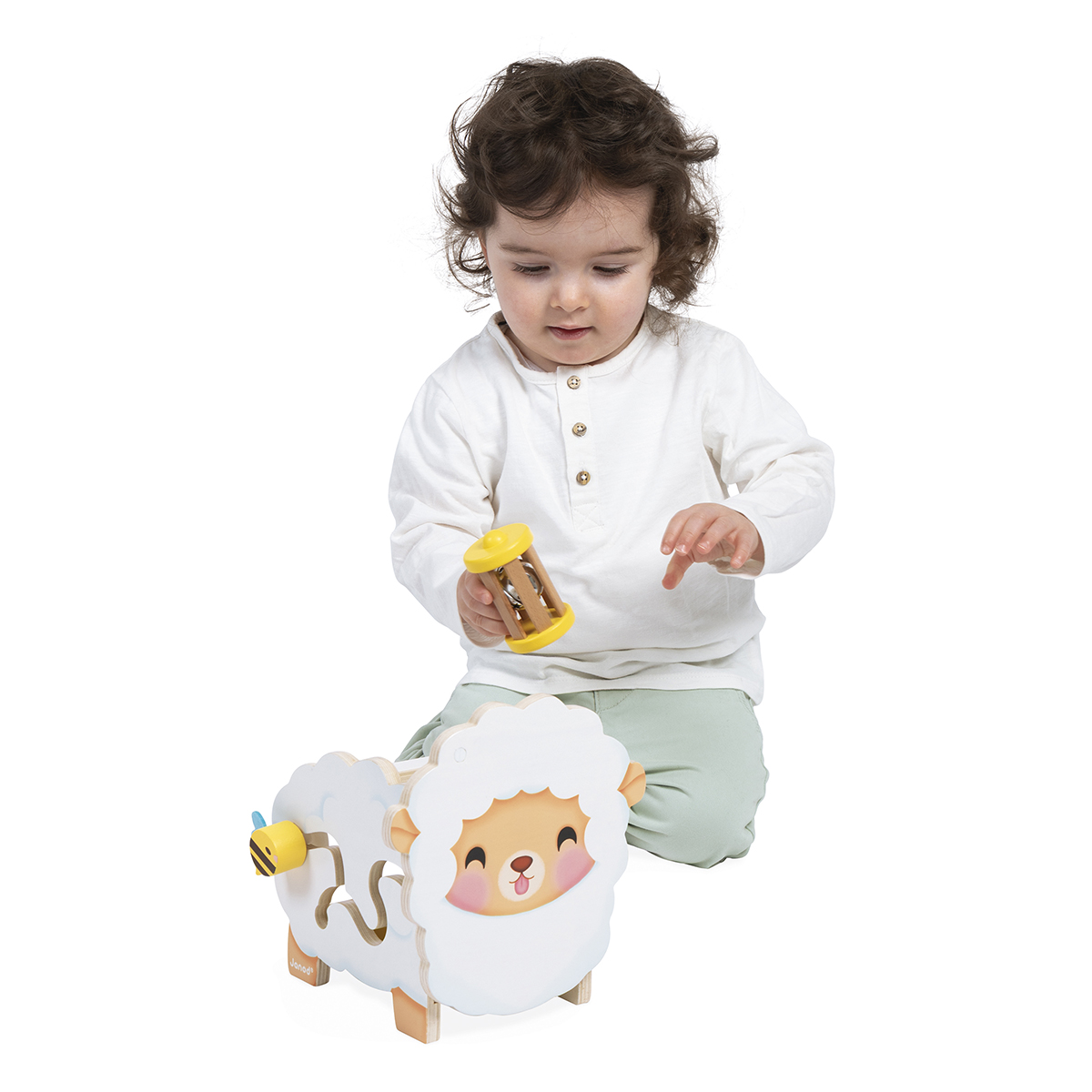 Voici le plus mignon des moutons Janod ! Il s'accompagne de 6 accessoires qui se rangent sur et dans le mouton. Le petit oiseau est magnétique et vient se nicher sur la tête. Sur son dos, on peut y mettre le hochet et le papillon qui se visse. Les fleurs s'encastrent sur les côtés et bébé y découvrira un miroir, une partie à gratter et un plexi transparent pour voir la vie en orange. Développe la motricité fine et l'imagination des enfants. Jouet en bois. Jouet d'éveil pour les enfants à partir de 12 mois.