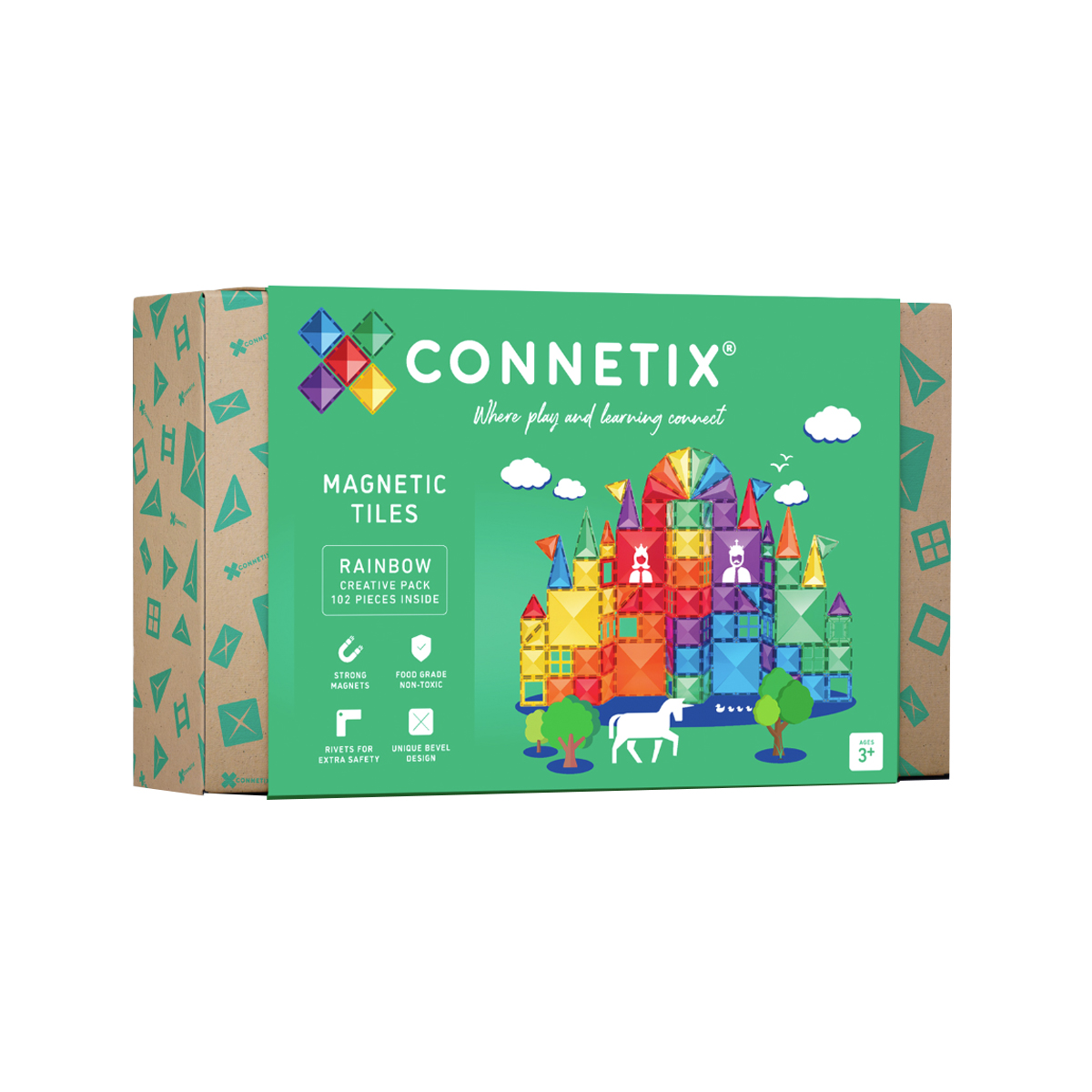 Le coffret créatif arc-en-ciel Connetix de 102 pièces garantit des heures de jeu créatif et libre! Offrant d'innombrables possibilités d'apprentissage ludique et créatif, ce coffret comprend une variété de blocs de construction magnétiques aux couleurs de l'arc-en-ciel, incluant des carrés de toutes tailles, des triangles équilatéraux, rectangles et isocèles, ainsi que des clôtures, des fenêtres et des cadres de porte! C'est le point de départ idéal pour des jeux en famille et la construction de plus grandes créations Connetix! Seul ou entre amis et en famille, ce coffret créatif favorise le développement des compétences en sciences, technologie, ingénierie et mathématiques (STEM), ainsi que la motricité fine et globale. Les enfants peuvent construire de grands châteaux et des fusées, de hauts murs, des circuits à billes et des toboggans à pièces, des ponts et des tours, découvrir des formes et des motifs, concevoir des boîtes de tri par couleur, et bien plus encore. Le coffret créatif Connetix encourage également la persévérance et la ténacité en permettant aux enfants de concevoir des constructions plus grandes et ainsi de repousser les limites de leur imagination. Les jouets à usage ouvert contribuent non seulement à développer l'imagination et la créativité de l'enfant, mais ils évoluent aussi avec lui au fur et à mesure de son apprentissage, de son développement et de la complexification croissante de ses jeux.
