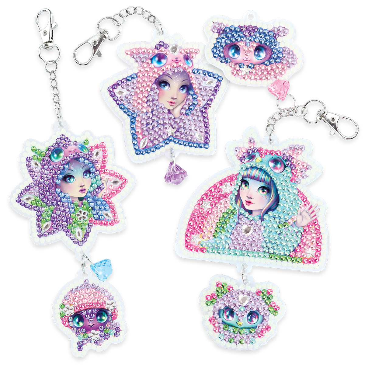 Créez 3 porte-clés magnifiques qui ne servent pas qu'à accrocher vos clés ! Décorez votre sac à main, votre sac à dos ou votre gourde. Leur fabrication est un vrai plaisir : il suffit de placer les strass scintillants sur les supports adhésifs et d'admirer leur éclat (voir le nuancier) ! Le kit comprend 6 bases en acrylique prêtes à décorer, 3 crochets pour porte-clés, 3 perles colorées, 12 anneaux, plus de 2 000 strass, un applicateur pour strass, un plateau à strass et un carré de cire.
