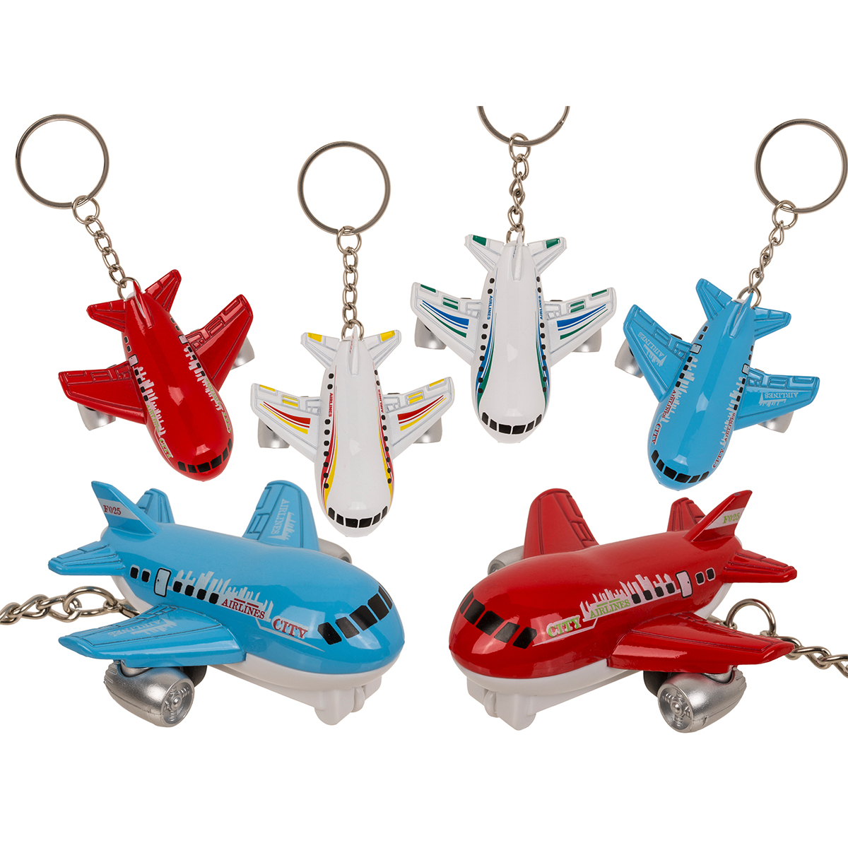 Porte-clés métallique, avion à moteur à rétrofriction, env. 10,5 cm, assortiment de 4 couleurs, 16 pièces dans un présentoir