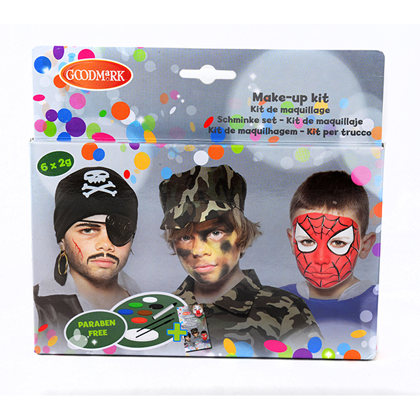 Avec ce set maquillage tu peux mitonner charakteren différents sur ton visage - comme garcon araignée, soldat, pirate