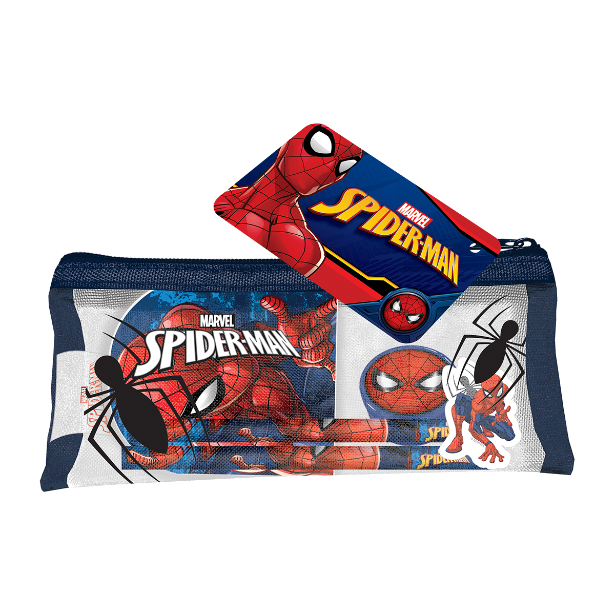 Trousse à crayons 20x9.5cm remplie avec des articles de papeterie: 2 crayons triangulaires, 1 taille-crayon rond, 1 gomme fantaisie, 1 bloc-notes fantaisie.