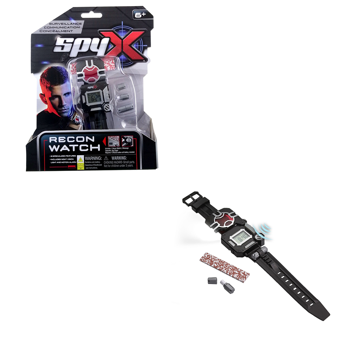 Montre multifonction avec vision nocturne, capteurs de lumière/mouvement, 2 capsules à messages et papier d’espionnage , pile CR2023 (non incluse). Dès 3 ans.