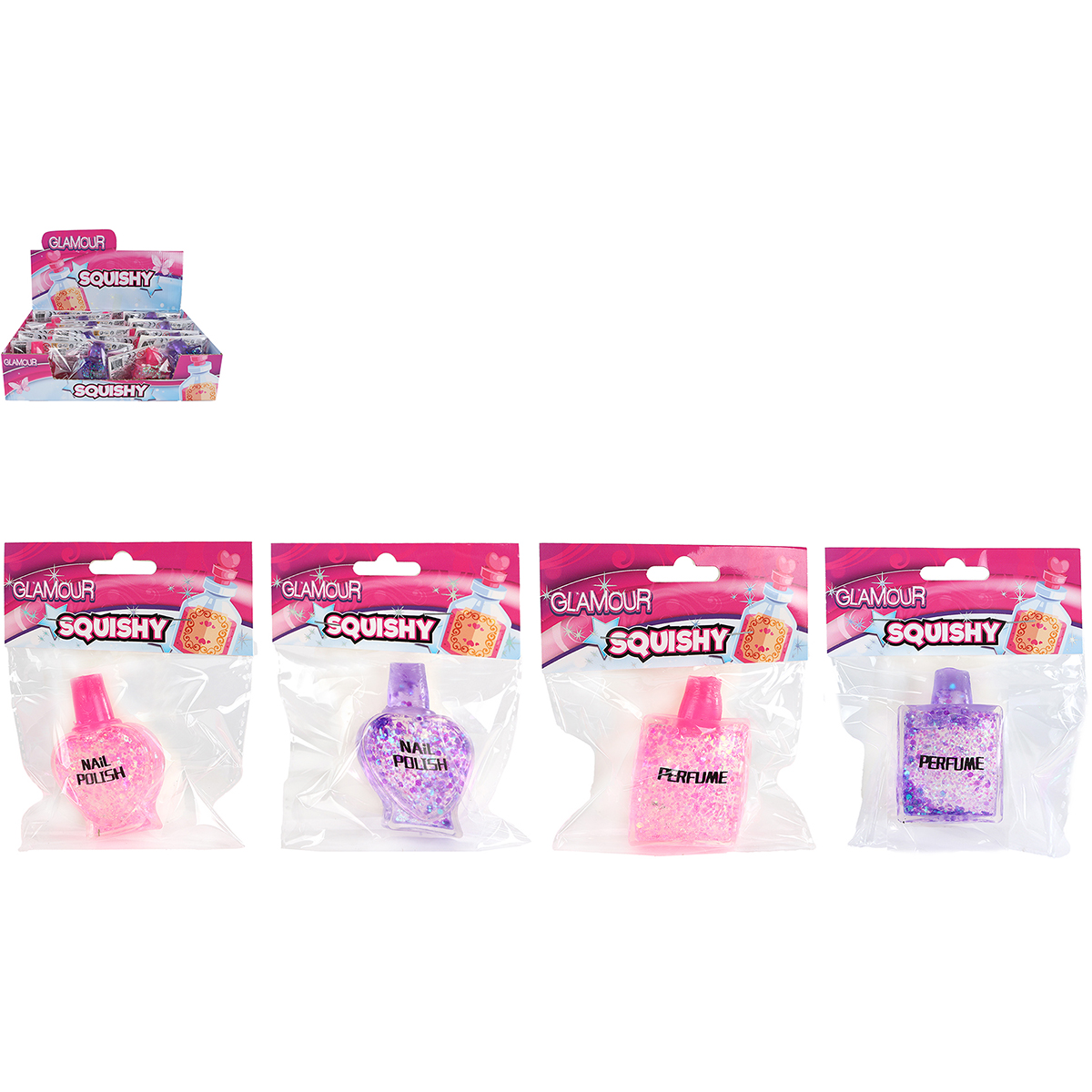 Squishy parfum et vernis à ongles assortis avec pailletes 2-fois assortis 7cm en display.