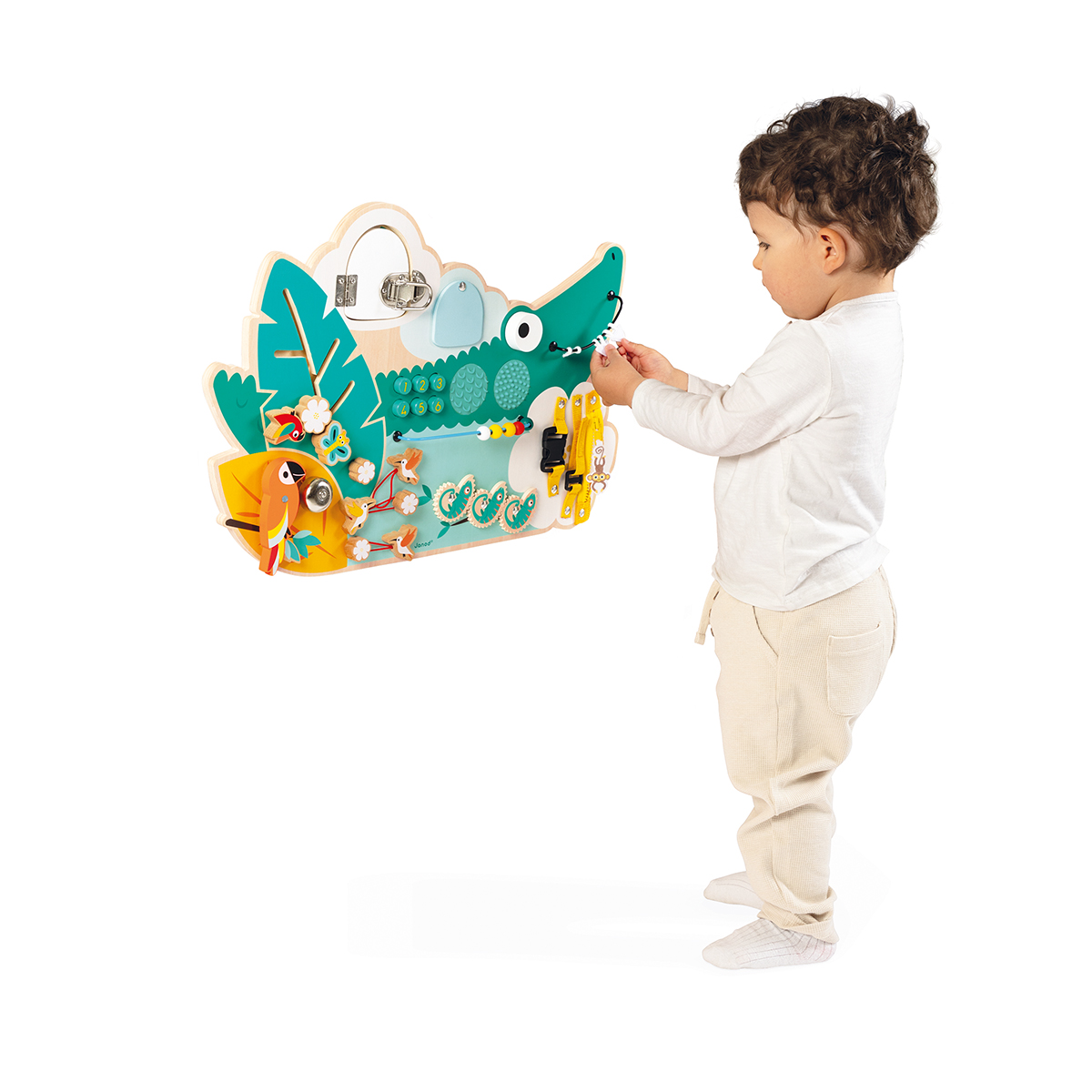 Caché au milieu de la jungle, Croco attend votre enfant pour jouer et découvrir plus de 14 d’activités! Ce jouet, complet, est composé de: un labyrinthe à manipuler, un œil rotatif sonore, 3 sangles avec différents systèmes de fermeture, des engrenages caméléons, une sonnette, une serrure métallique, un miroir caché, un boulier avec des billes en bois, des textures en silicone, des boutons à pousser, des élastiques à attacher, de la feutrine à toucher. Des heures de découvertes assurées! Jouet idéal pour développer la curiosité et la motricité. Jouet d’éveil en bois. Pour les enfants à partir de 18 mois.