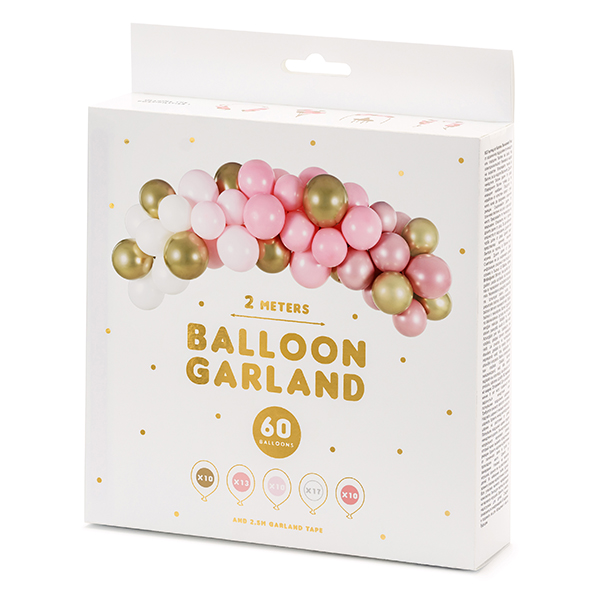 Ballon Girlande Rose, 2 Meter lang. Das Set beinhaltet 10 Ballons in Gold, 10 in Pastell Pink, 10 in metallic Rose, Gold, 13 in Pastel Blush Pink und 17 in weiss. Ebenfalls ein 2.5 Band für die Ballone.
