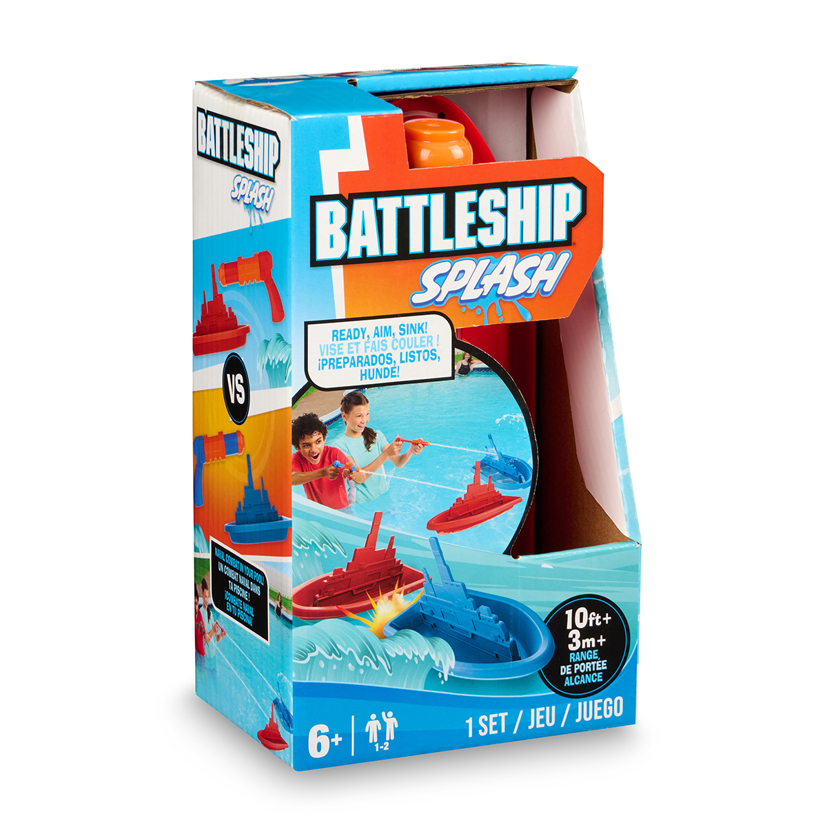Seeschlacht im Schwimmbecken - Ziele und versenke deinen Gegner, aber lass dich nicht treffen! Inhalt: 2 Wasserspritzer mit 3 Meter Reichweite und Schnellaufladung unter Wasser, 2 Schiffe (1x rot, 1x blau), Anleitung.
