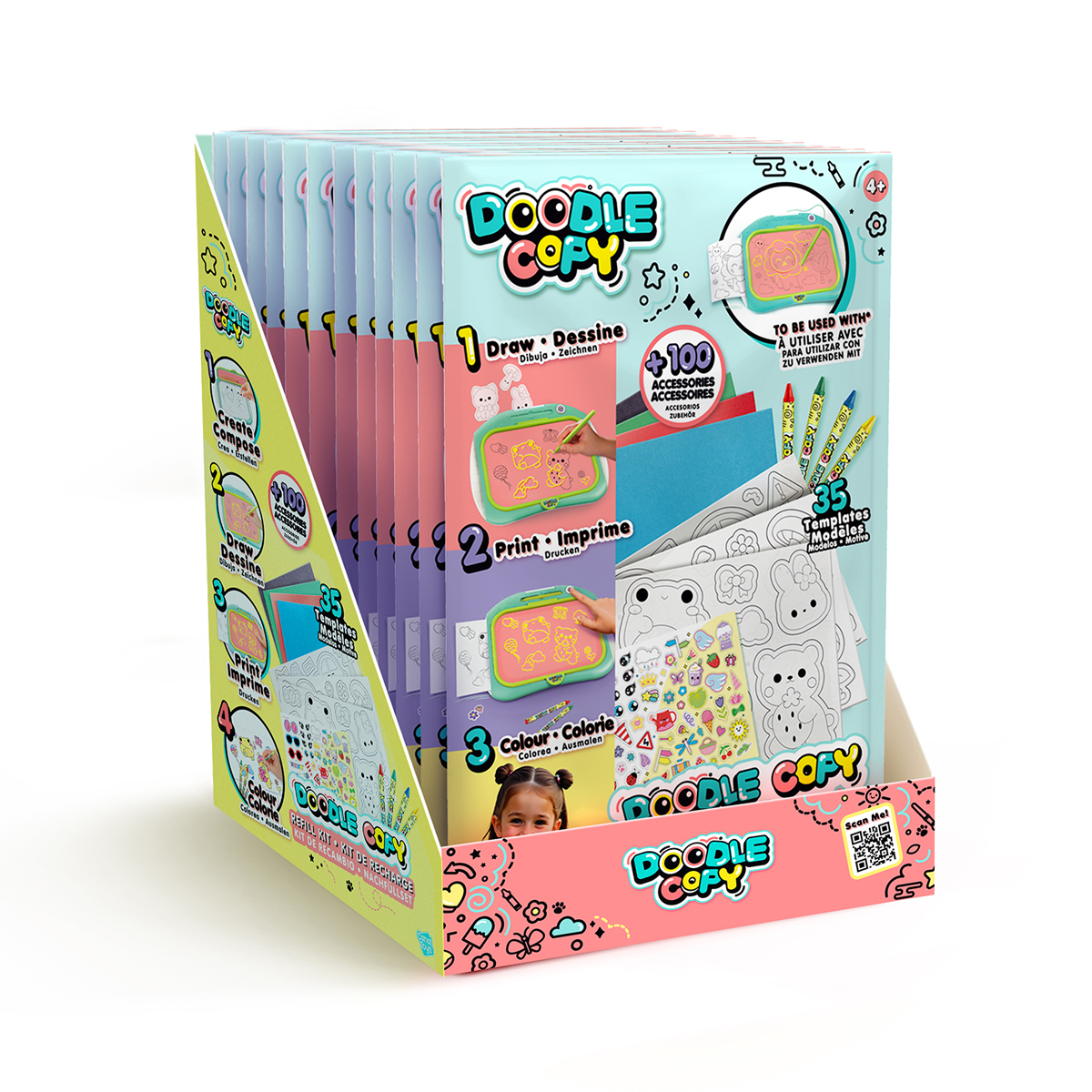 Entdecken Sie die Doodle Copy, das perfekte Spielzeug zum Zeichnen lernen! Wähle einfach eine Vorlage, lege sie auf das Gerät und zeichne sie nach. Wenn du fertig bist, drückst du auf den Knopf, um deine Zeichnung zu drucken! Jetzt musst du sie nur noch ausmalen! Inhalt : 1 Kopiergerät, Kohlepapier, 35 Vorlagen, Papiere, Bleistift