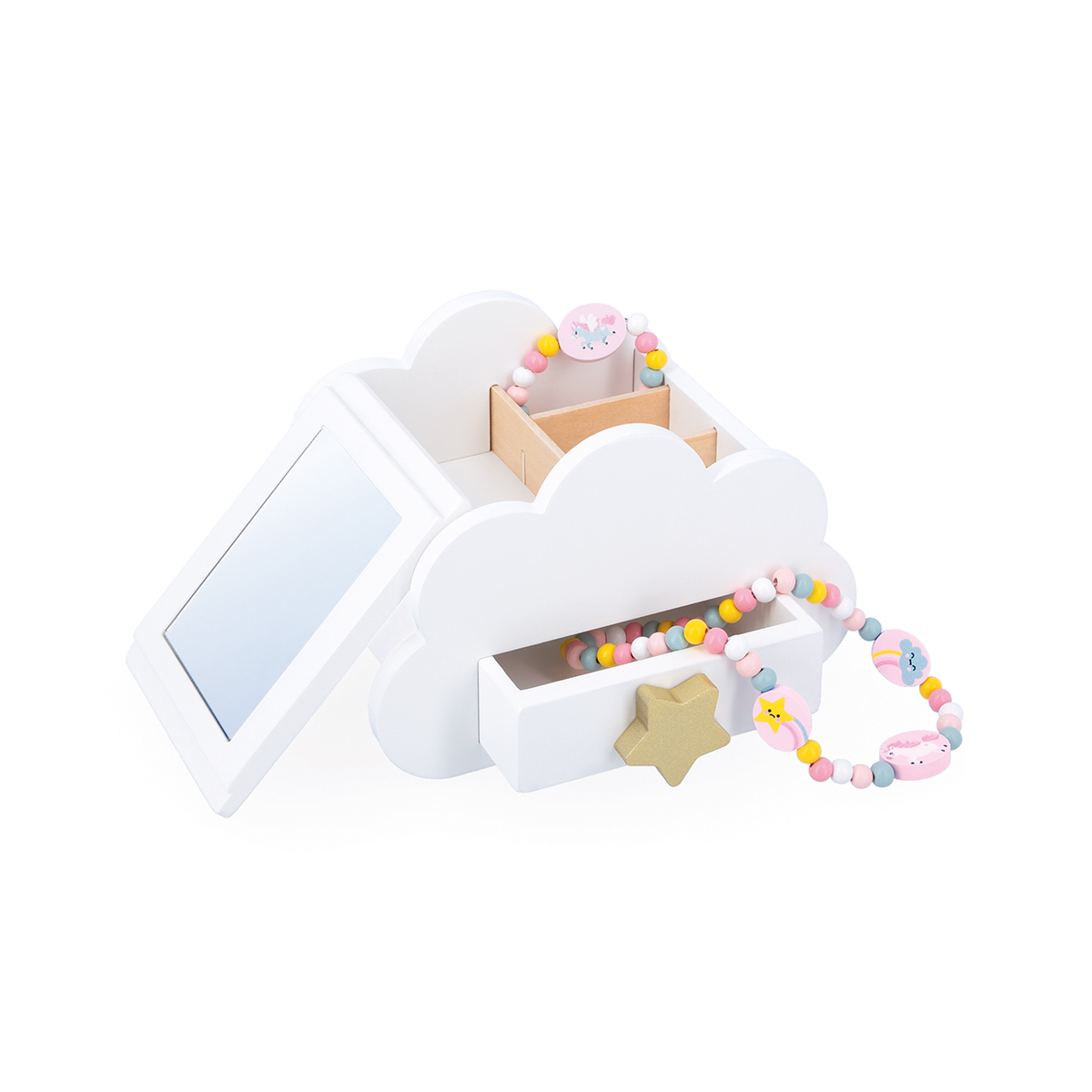 In dieser hübschen Schatulle voller Überraschungen kann Ihr Kind seinen Schmuck, seine Einhorn-Accessoires und viele andere kleine Wunder sorgfältig aufbewahren! Diese Schmuckschatulle in Form einer Wolke ist praktisch, magisch und schön zugleich. Mithilfe ihres Sterns lässt sich der Deckel und eine geheime Schublade öffnen! Enthält ein Armband und eine Halskette zum Thema Einhörner. Produkt aus Holz für Kinder ab 3 Jahren.