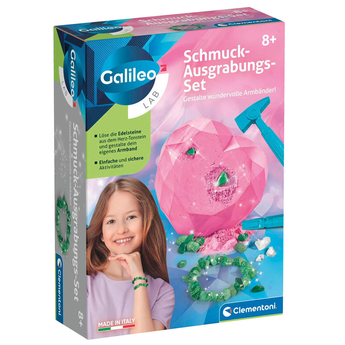 Schmuck-Ausgrabungs-Set. Grabe in dem BLock und entdecke echte Edelsteine, die du in ein einzigartiges Armband verwandeln kannst. Eine umfassende Aktivität, die Aufmerksamkeit, Geschicklichkeit und Kreativität fördert. Ein Komplettset mit Werkzeug, Edelsteinen und Bändern, um gleich kreativ werden zu können.
