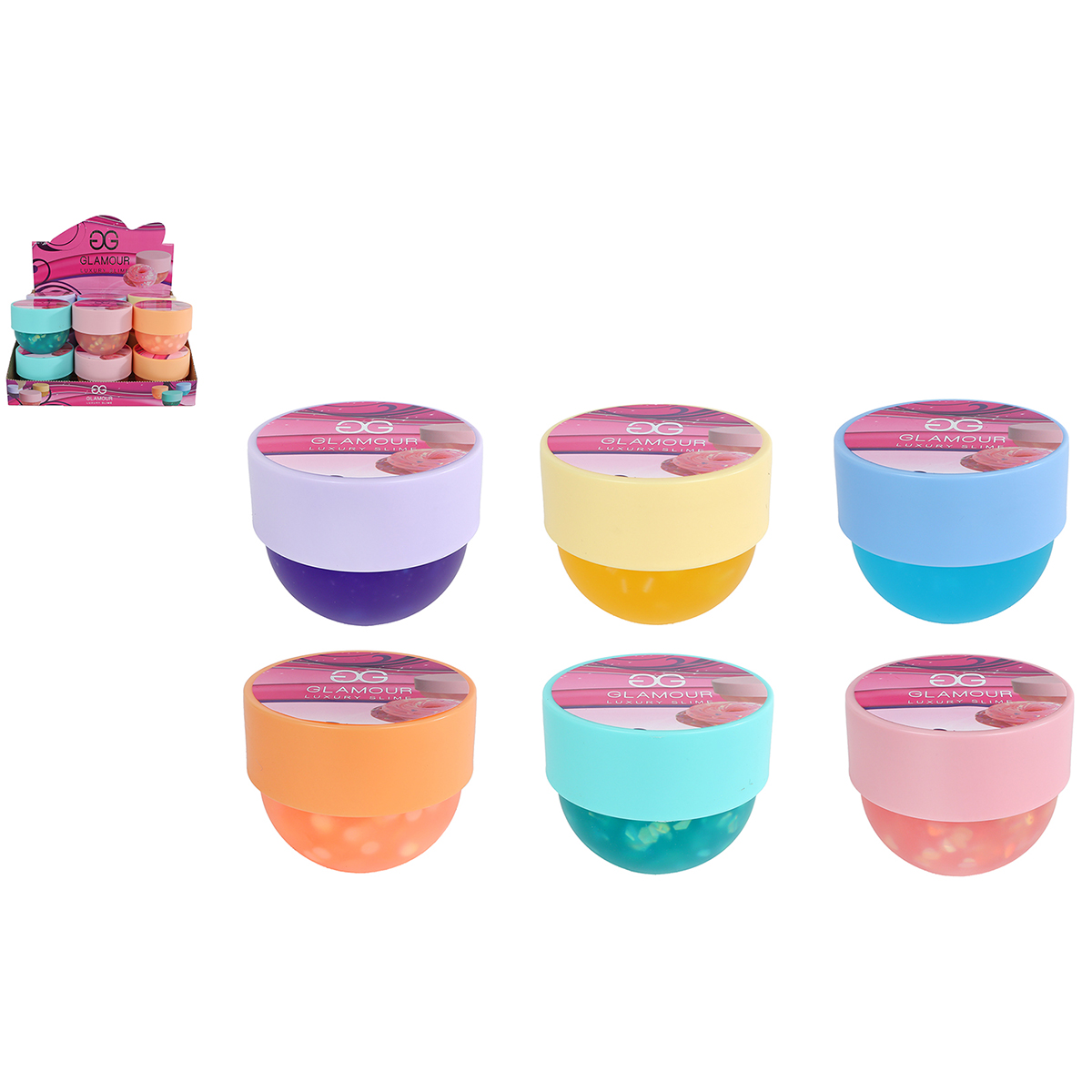 Glamour Crystal Slime im Kosmetiktiegel 7.6cm, 160 ml 6-fach assortiert in Display.