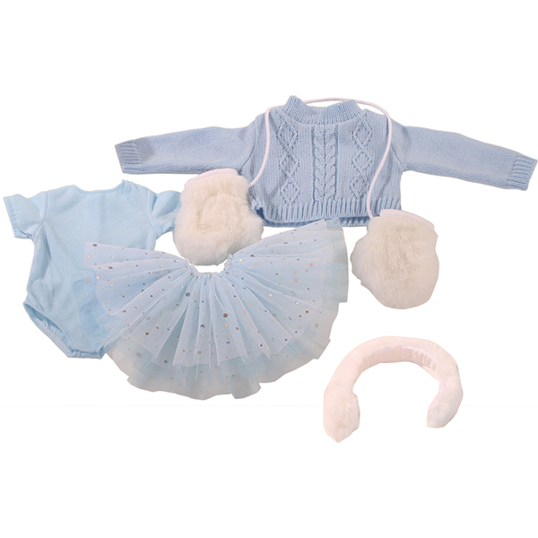 Wunderschöne 5 teilig Babykombination bestehend aus Body, Jupe, Pullover in blau, Haarreif, und Handschuhe in weiss für Puppen der Grösse 45-50cm