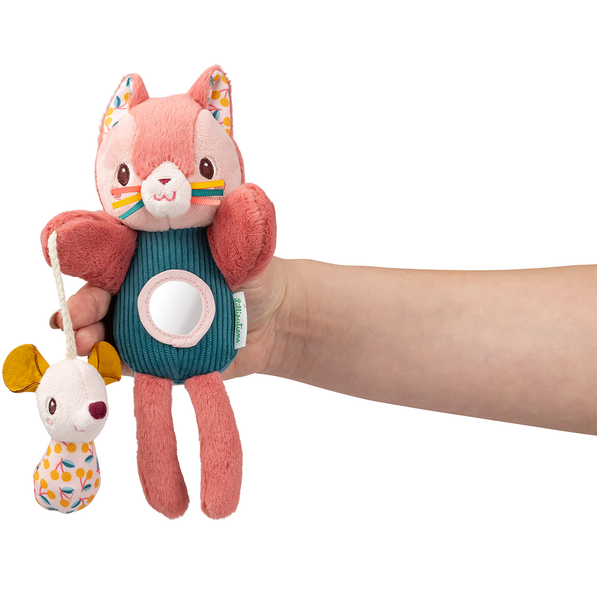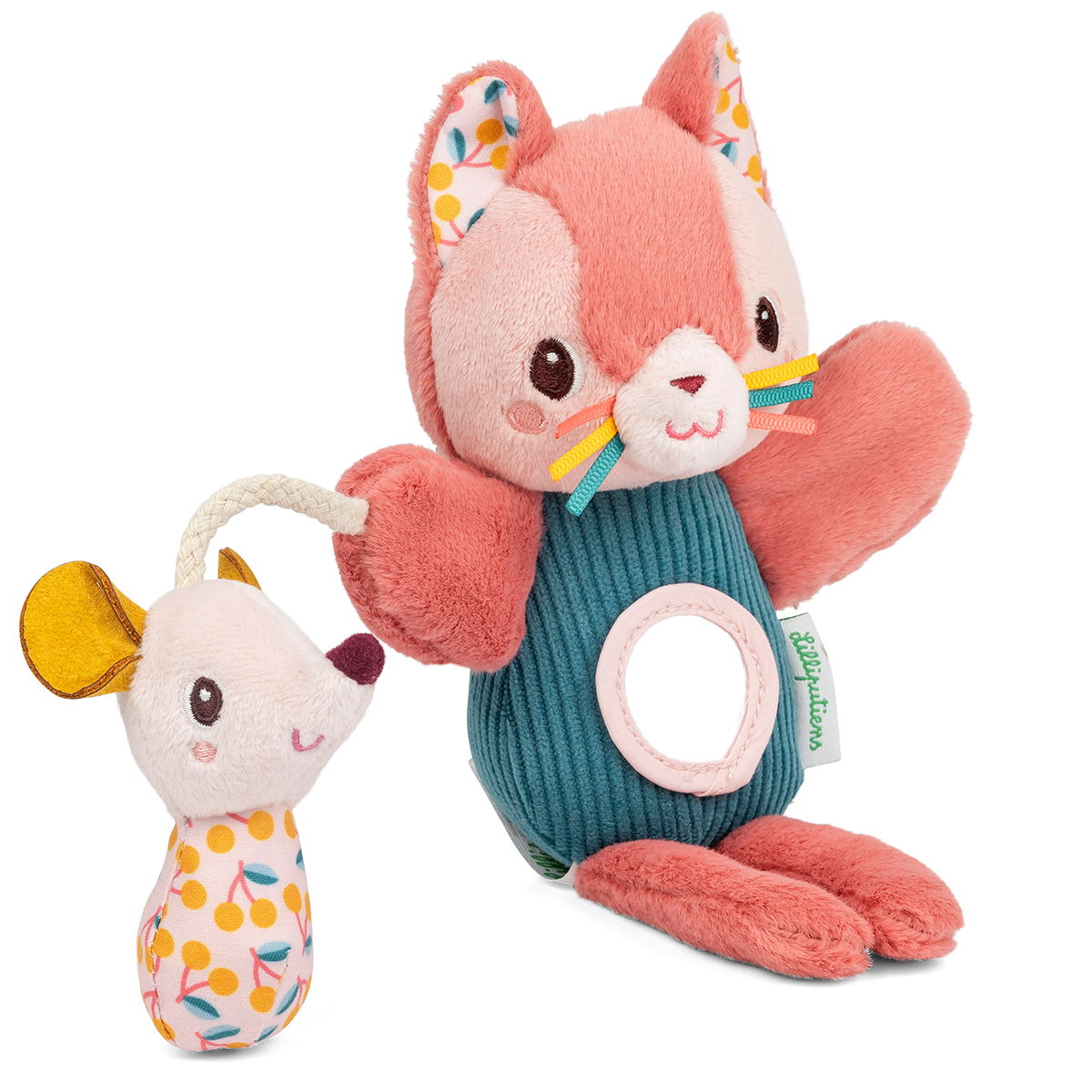 Zeit, mit der Jeanne-Puppe zu spielen! Diese kleine Fingerpuppe ist ideal, um Babys ab 6 Monaten zu unterhalten. Mit seiner praktischen Größe passt es in jede Tasche und erwacht wie von Zauberhand zum Leben – zur Freude der Kleinen! Dazu einfach mit den Fingern durch die beiden Arme der Puppe fahren und schon kann es losgehen ins Abenteuer. Mit dieser Plüschpuppe können Sie auch Lieder, Kinderreime und andere Geschichten Ihres Kindes zum Leben erwecken. Aber das ist noch nicht alles! Diese Lilliputiens-Handpuppe bietet 3 Aktivitäten, um die Sinne Ihres Kleinen zu unterhalten und zu stimulieren. Erstens eine Rassel an Jeannes Kopf, die fröhlich klingelt, wenn Sie sie bewegen. Dann ermöglicht ein runder Spiegel auf seinem Bauch Ihrem Kleinen, sich selbst zu bewundern. Und das Beste kommt natürlich zum Schluss: Die lustige kleine Maus, Jeannes beste Freundin, knistert vor Raschelpapier. Diese Plüschpuppe ist daher ein ideales Lernspielzeug, um das Seh- und Hörvermögen des Babys, aber auch seine Motorik und Vorstellungskraft zu fördern. Wir lieben die hübschen Kirschabdrücke, die kleinen Schnurrhaare und die langen, weichen Beine unserer Gartenkatze! Dieses Spielzeug für das erste Lebensjahr können Sie bei 30° in der Maschine waschen.