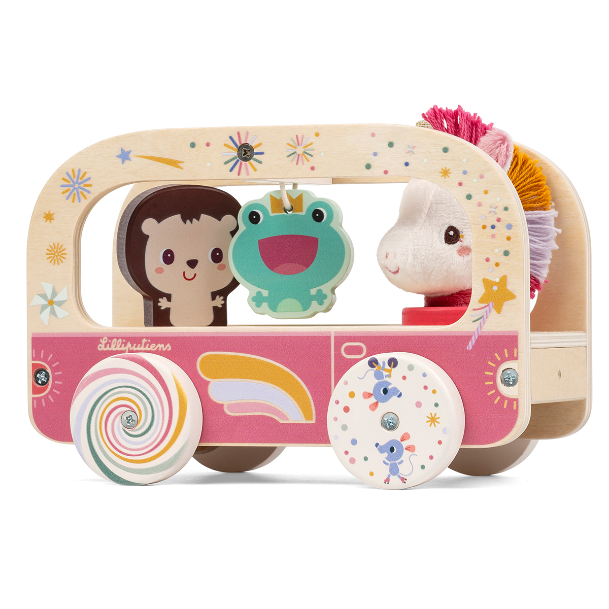 Der Lilliputiens Lena Holzbus ist ein farbenfrohes und spannendes Aktivitätsspielzeug, das die Kleinsten zu Abenteuern einlädt. Der kleine Bus ist für Kinder ab 10 Monaten geeignet und unterstützt die Entwicklung von Motorik, Fantasie und Neugier. Mit beweglichen Figuren, lustigen Details und einer abnehmbaren Schnur kann der Bus geschoben, gezogen und erkundet werden. Der Lilliputiens Lena Holzbus verbindet motorische Übungen, sinnliche Erfahrungen und fantasievolles Spielen in einem Spielzeug. Ideal für Kinder, die die Welt erkunden, rollen und ihre ersten Schritte mit Lena Einhorn und ihren magischen Freunden machen möchten. Pflege: Plüschfigur maschinenwaschbar bei 30 °C, Bus mit feuchtem Tuch abwischbar. Material: Polyester.