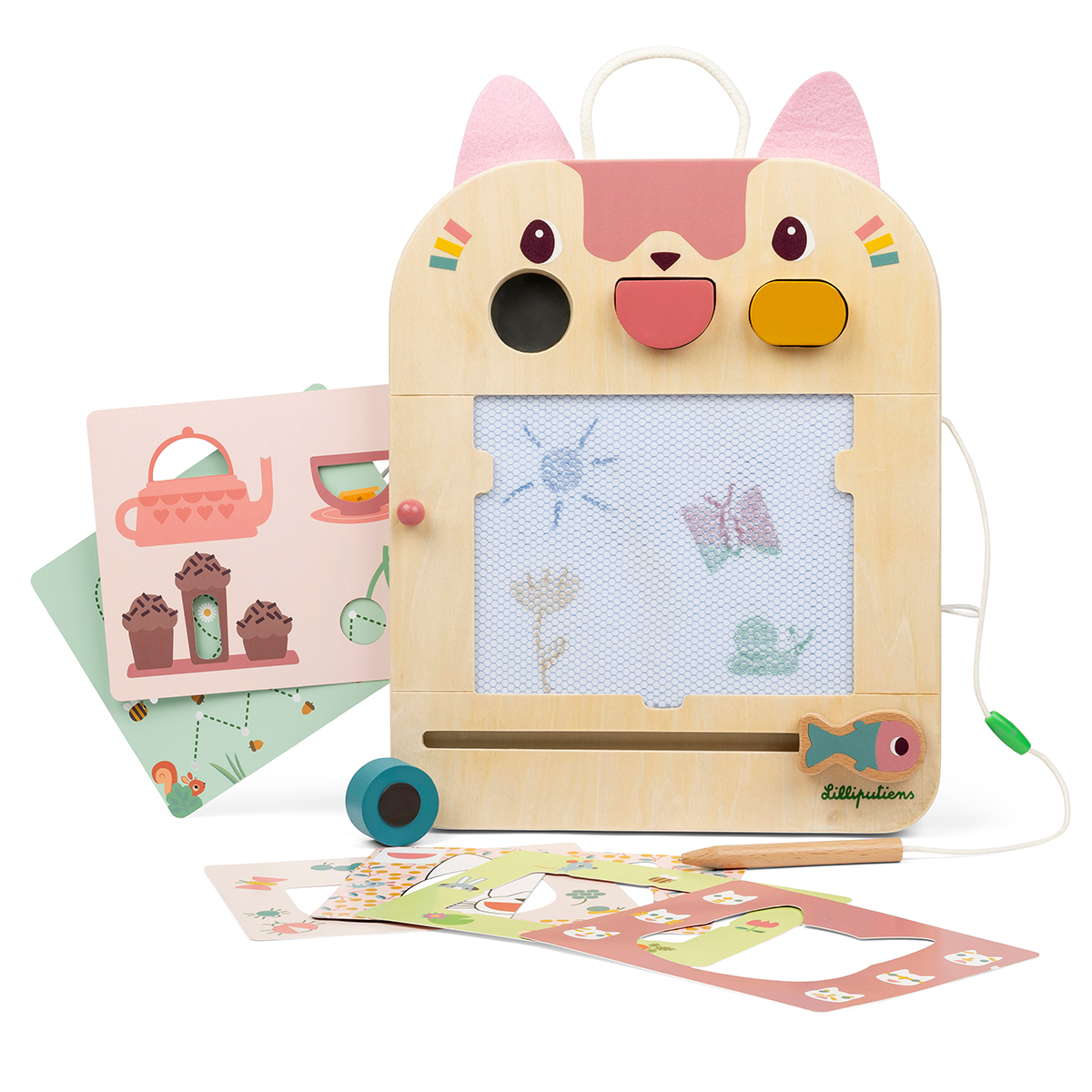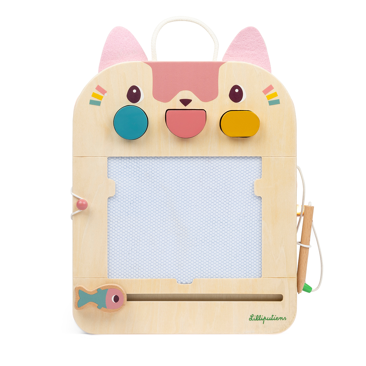Eine zauberhafte, einzigartige und originelle Schiefertafel! Mit der Holztafel „Jeanne die Katze“ können Kinder ab 18 Monaten malen und viele kleine Spiele genießen. Zusammen mit 6 doppelseitigen Karten stehen insgesamt 12 Spiele zur Verfügung, mit denen die Kleinen lange beschäftigt sein werden! Der mit einer Schnur an der rechten Seite der Schiefertafel befestigte Holzstift geht nie verloren. Es kann jedoch bei Bedarf abgenommen werden. Bei ihm ist Platz für künstlerischen Ausdruck im Gesicht der hübschen Jeanne! Aber das ist noch nicht alles: Diese magische Tafel von Lilliputiens bietet 3 Formen (blauer Kreis, gelbes Oval, rosa Halbkreis), die sehr nützlich sind, um originelle Zeichnungen zu erstellen oder die verfügbaren Aktivitäten durchzuführen. Auf der linken Seite der Tafel lassen sich alle Aktivitätskarten einschieben und bequem verstauen. Damit formt Ihr Kind lustige Gesichter, lernt Linien oder Pfade zu zeichnen. Es gibt Spiele für jeden Geschmack, mehr oder weniger komplex zu machen, für immer eine größere Herausforderung! Und um alles zu löschen, schieben Sie einfach den kleinen Fisch. Weil wir Überraschungen lieben, werden Sie und Ihr Kind auf der Zeichenfläche verschiedene Farben entdecken. Diese Zaubertafel ist ideal, um Kinder unterwegs zu unterhalten: Alle Zubehörteile lassen sich leicht verstauen und dank des praktischen Griffs lässt sie sich überallhin mitnehmen. Und was für hübsche rosa Ohren! Mit der Holztafel entwickelt Ihr Kleines seine Feinmotorik, Vorstellungskraft und sein Denkvermögen.