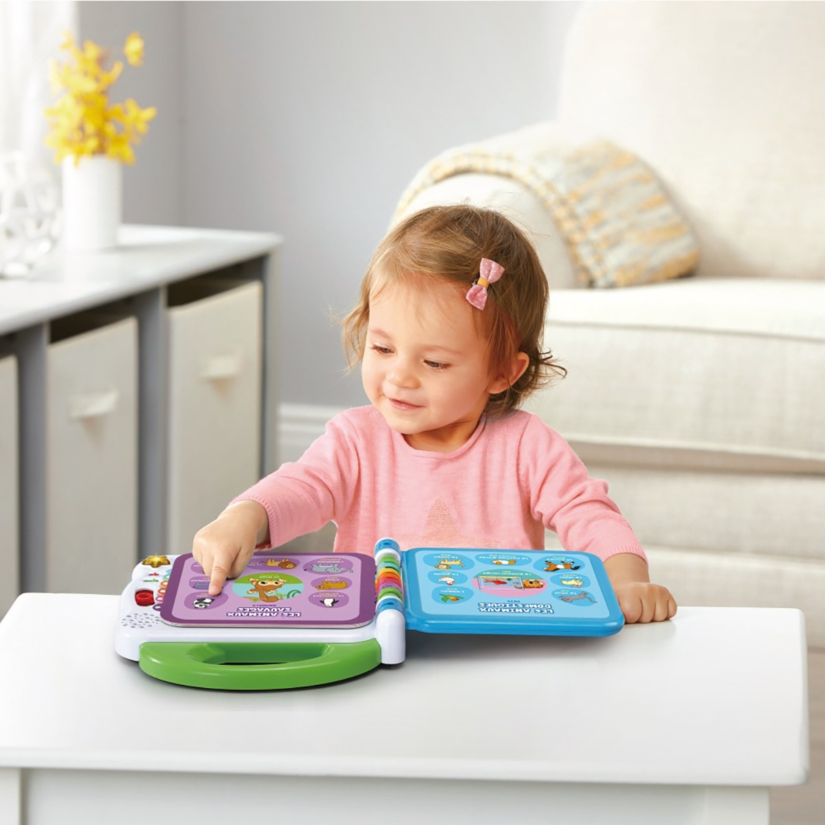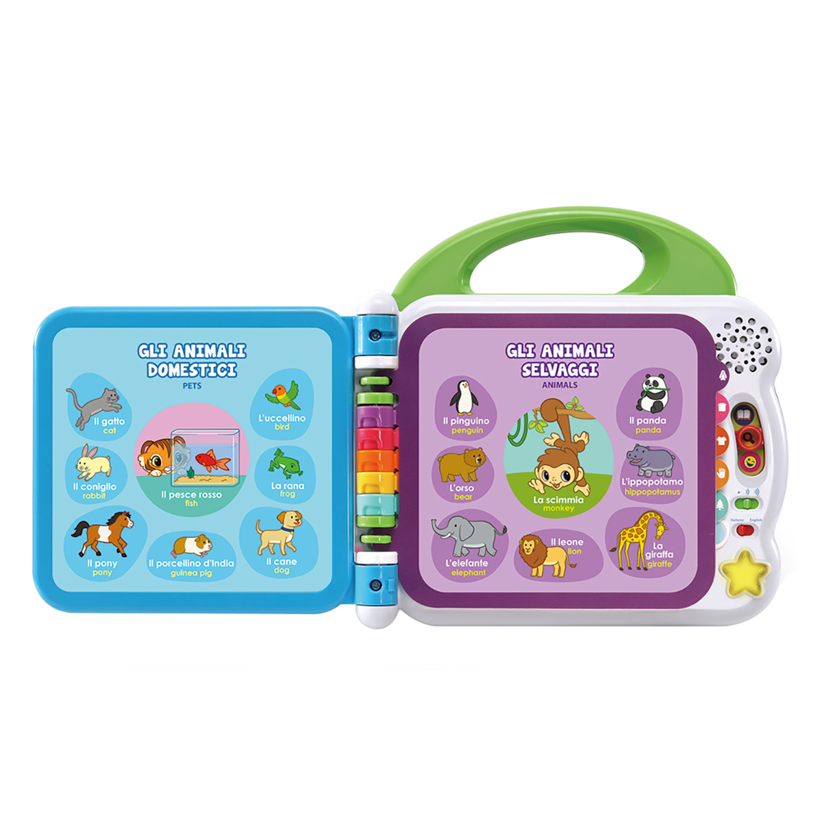 Il primo libro illustrato parlante e bilingue al 100% per bambini! Questo libro illustrato interattivo e parlante ti permette di scoprire 100 parole del vocabolario in italiano e inglese. Il libro ha 12 pagine educative laminate e illustrate con sensori per selezionare le illustrazioni e fare molte scoperte. Ogni pagina di apprendimento è classificata per tema: animali domestici/selvaggi, frutta, alimenti, colori, parti del corpo, opposti... 3 modalità di gioco: Vocabolario, Divertimento e Suoni divertenti. Il manico adatto ai più piccoli permette una facile presa. 2 canzoni in italiano 2 canzoni in inglese e divertenti effetti sonori. 100% bilingue.
