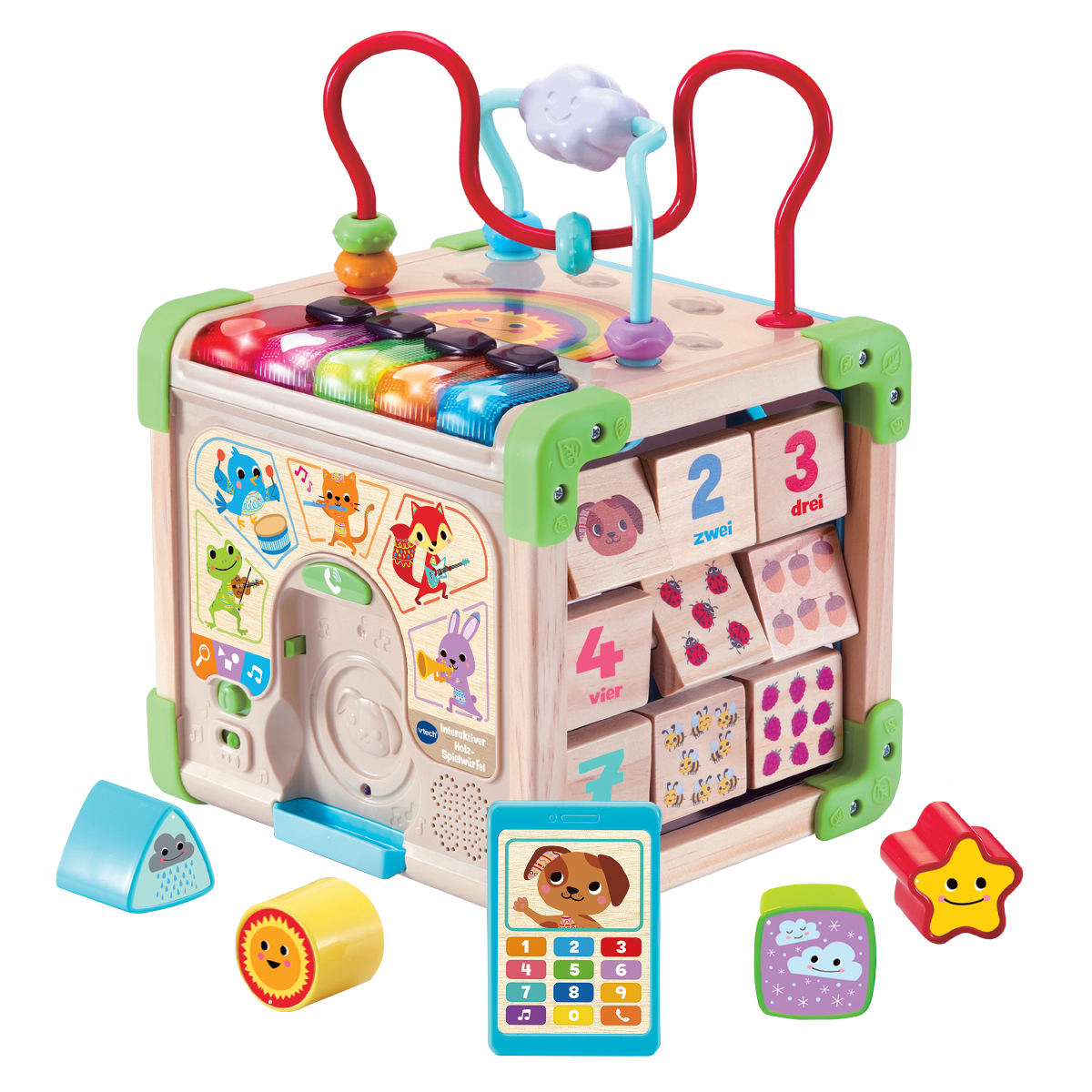 Nachhaltig produzierter Lernwürfel für kunterbunten Spielspaß. Liebevoll gestalteter Holzwürfel mit individuellen Würfelseiten und verschiedenen Elementen. 3 Spielmodi: Musik, Lernen, Entdecken. 5 Klaviertasten für Farben, Formen und Musik. Auf dem Würfel befinden sich bunte Holzperlen, die man über den Abakus schieben kann. Berührt das Kind die Tiere, stellen sie sich vor und verraten, welche Instrumente sie spielen.Lerninhalte: Formen, Farben, Zahlen, Zählen. Abnehmbares Telefon: Als Rassel benutzen oder Tierfreunde anrufen. Zahlenblöcke drehen, um bunte Tiere oder Objekte zu entdecken und zu zählen. Das Drehen der Zahnräder und das Verschieben der Tiere schult die Feinmotorik. 1 gesungenes Lied und zahlreiche kurze Melodien. Kindersicheres Batteriefach, Abschaltautomatik und Lautstärkeregler
