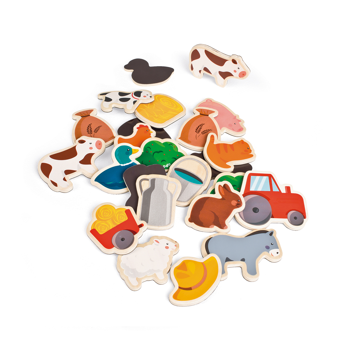 24 Magnete aus Holz für Tafeln (oder andere magnetische Oberflächen) mit Motiven vom Bauernhof. Ideal zum spielerischen Entdecken der Welt des Bauernhofs.