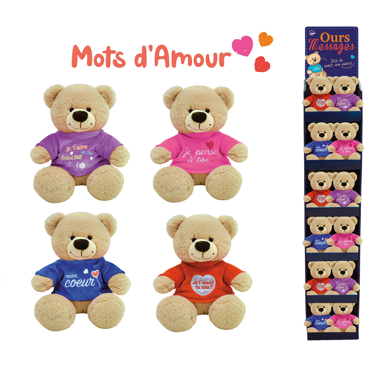 Assortiert mit 4 Bären mit deren Aufschriften: "je t`aime, tu sais?", "je pense a toi", "je t'aime un peu, beaucoup, a la folie", "mon coeur"