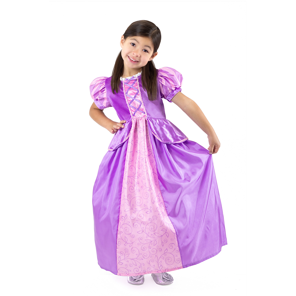 Ihre kleine Prinzessin kann sich in diesem wunderschönen, bequemen Rapunzel-Kleid rundum wohlfühlen. Weiches, violettes Samtoberteil mit bauschigen Prinzessinnenärmeln. Verziert mit violetten und rosa Borten, die perfekt zum geschnürten Einsatz passen. Zweifarbiger Rock aus Seide mit einem prächtigen Blattmuster. Atmungsaktiv, seidig weich, aus 100 % Polyester.