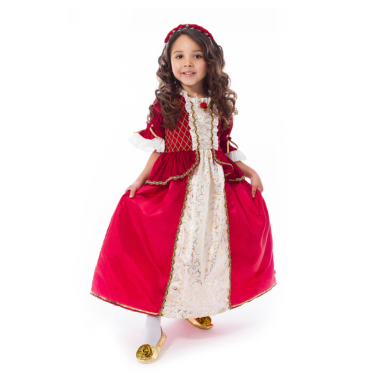 Dieses Kleid ist ein echter Klassiker und perfekt für Herbst, Winter oder eigentlich jede Jahreszeit. Es ist eine ideale Ergänzung für die Kostümsammlung Ihres Kindes. Das tiefrote, dehnbare Samtoberteil ist mit einem Steppmuster, goldenen Borten und einer roten Rose verziert. Die halblangen Ärmel mit goldenen Borten enden in einer wunderschönen weißen Rüsche. Der rote Rock aus Chinaseide mit einem elfenbeinfarbenen Einsatz in glitzerndem Goldwirbel rundet den luxuriösen Look dieses Kleides ab. Atmungsaktiv, seidig weich, aus 100 % Polyester.