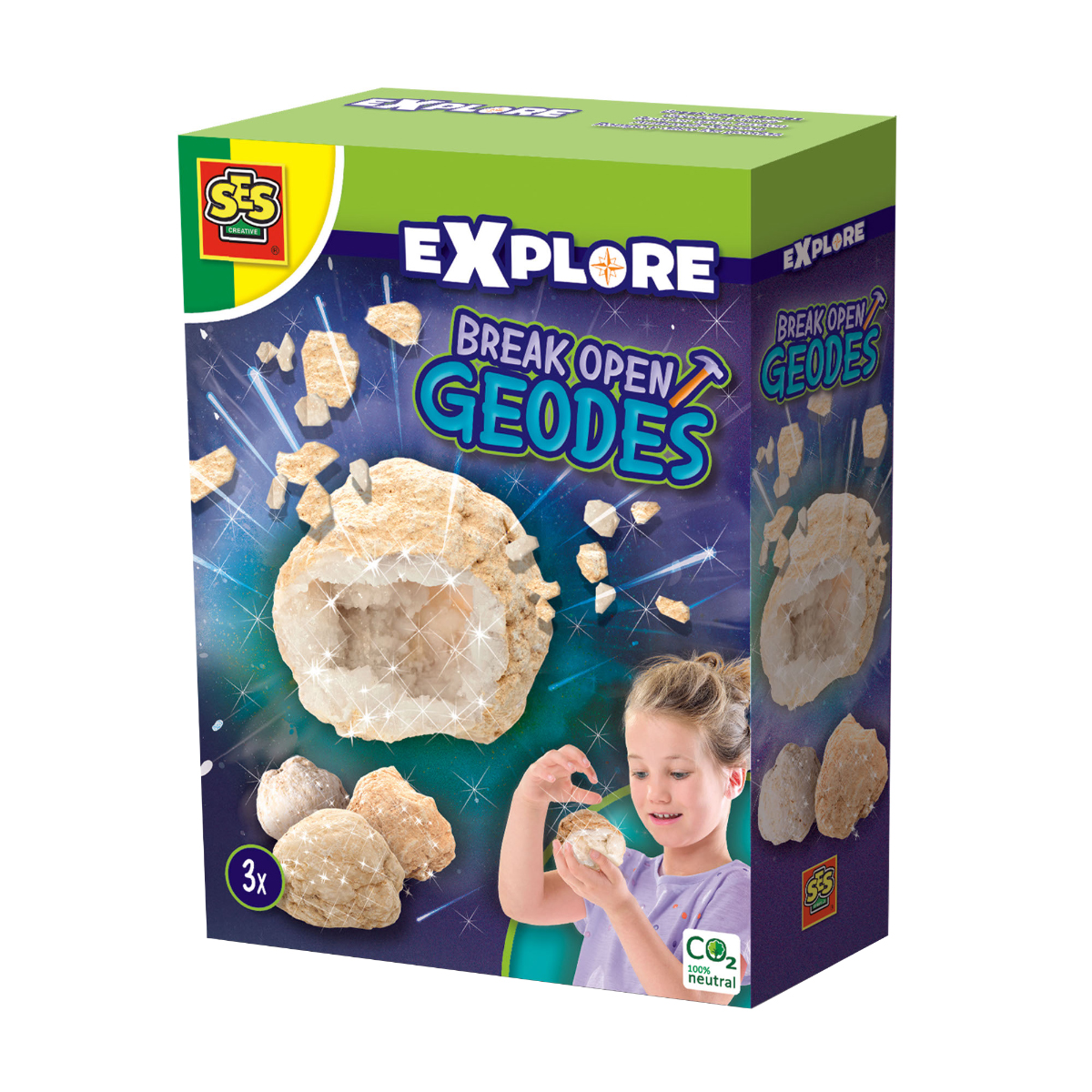 Versteckte Schätze! Mit diesem Set Geoden aufbrechen von SES Creative geht man auf echte Schatzsuche und Entdeckertour. Zunächst sehen die Geodensteine von außen eher unscheinbar aus, doch das ändert sich schnell, sobald man sie aufbricht. Im Inneren der Geode versteckt sich nämlich ein kleiner Naturschatz: ein funkelnder Kristall! Um diese Überraschung zum Vorschein zu bringen, wird die Geode zunächst in die beiliegende Kunststofftüte gelegt, so dass alle Splitter, die durch das Knacken entstehen, in der Tüte bleiben. Ist alles gut verschlossen, kann man nun z.B. mit einem Hammer auf die Geode schlagen und somit das Gestein brechen. Eine Anleitung erklärt die einzelnen Schritte ganz genau, da kann gar nichts mehr schiefgehen.