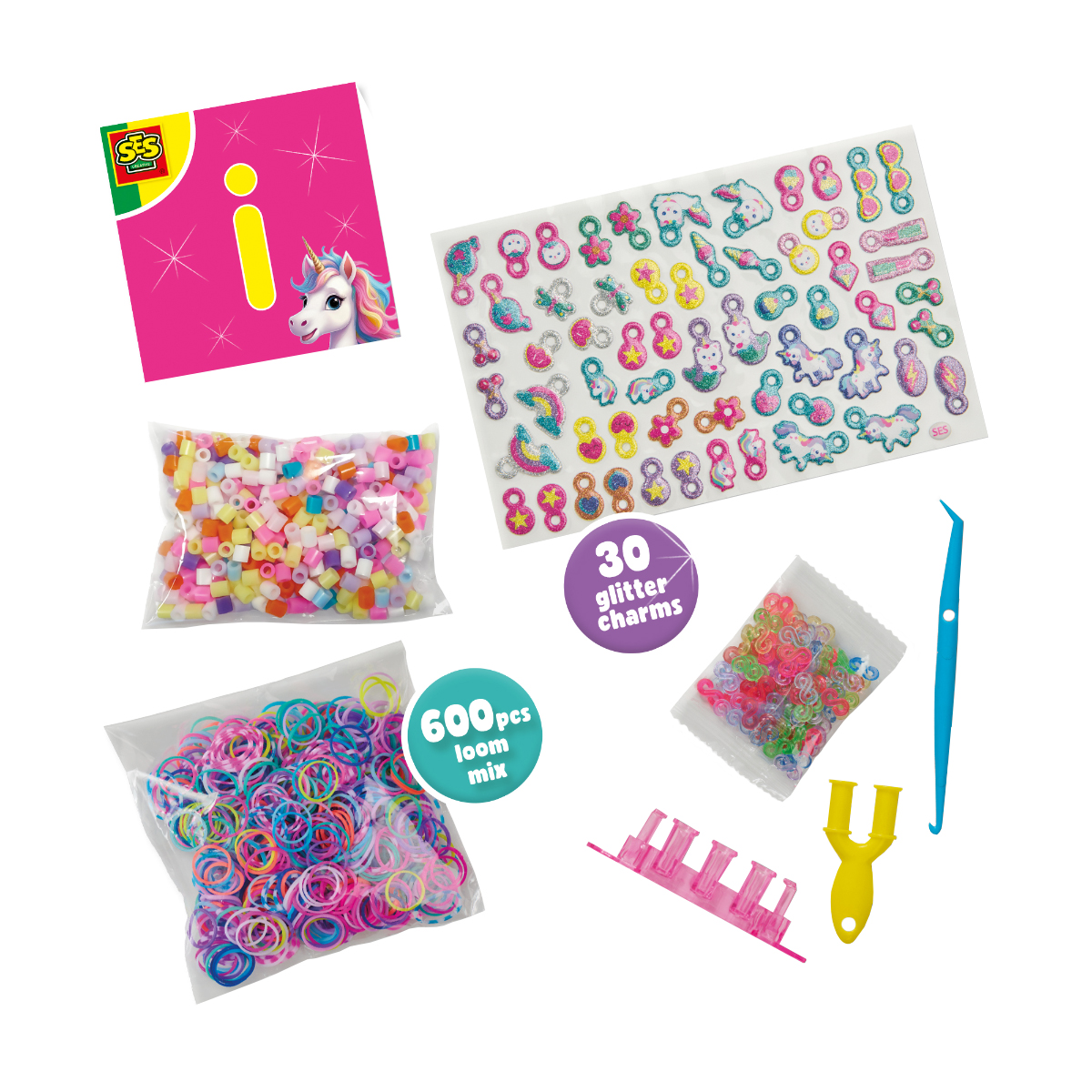 Gestalte deine eigenen trendigen Einhorn-Webarmbänder mit dem Einhorn-Webset! Entdecke eine Welt voller Kreativität und kreiere den süßesten Einhorn-Schmuck mit dem SES Creative Einhorn-Webset. Bastle (Freundschafts-)Armbänder allein oder zusammen mit deinen Freunden. Mit den besonderen Perlen und selbstgemachten Einhorn-Anhängern wird es noch schöner! Was dieses Set so toll macht: 600 Webgummibänder im trendigen Einhorn-Design, Selbstgemachte Glitzer-Einhorn-Anhänger für noch mehr Bastelspaß, Verziere deine Kreation mit Perlen in 8 verschiedenen Farben, Allein oder zusammen mit anderen macht es Spaß, sowie Anleitung und Werkzeuge für verschiedene Webtechniken