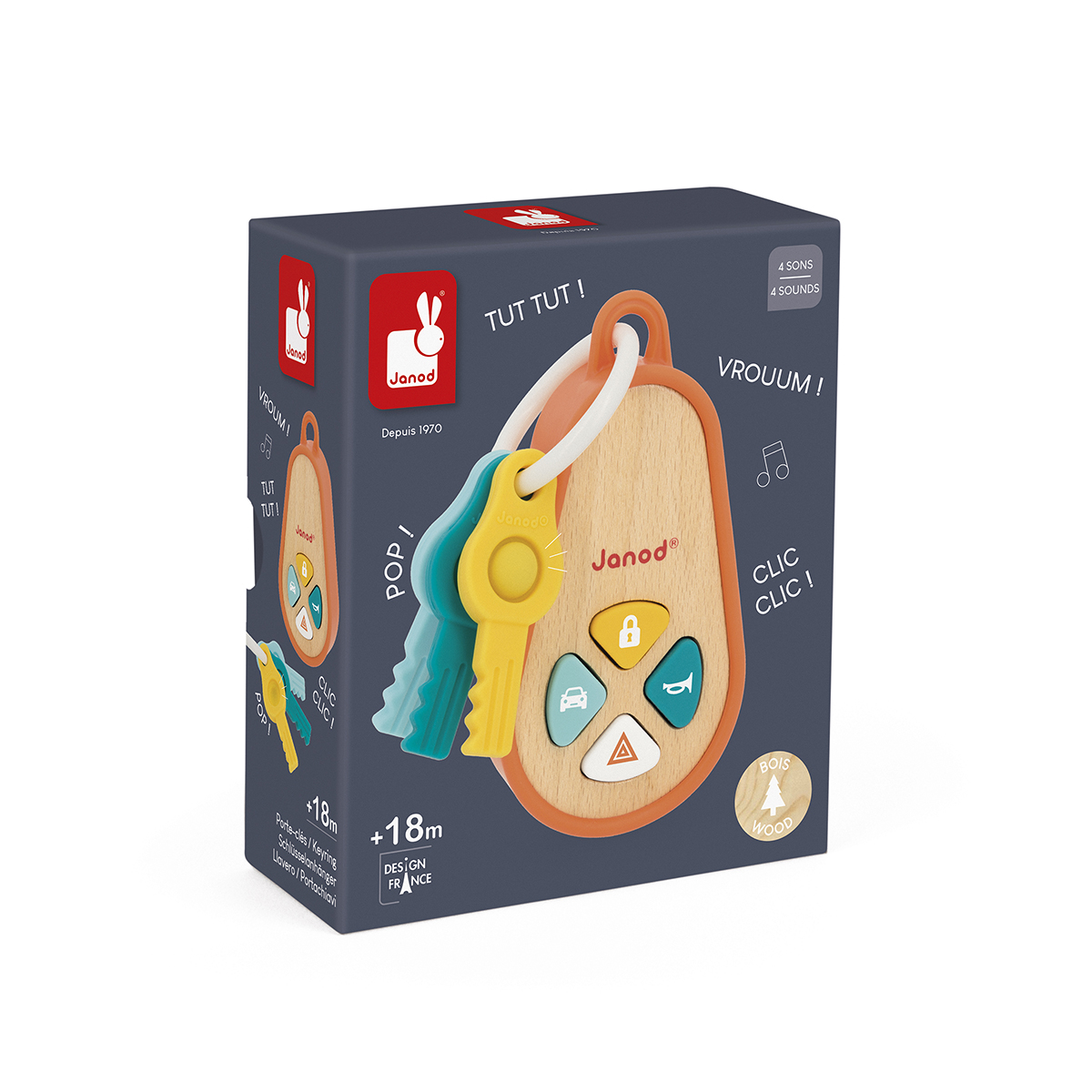 Alle Kleinen träumen von ihrem eigenen Schlüsselanhänger! Dieser hier ist genau für sie gemacht. Dank der Silikonhülle liegt er gut in der Hand und begeistert mit 4 Knöpfen und realistischen Geräuschen: Öffnen, Hupen, Warnblinker und Motorstart. Die 3 Silikonschlüssel mit Pop-it-Funktion fördern die Feinmotorik, die sensorische Entwicklung und die Hand-Auge-Koordination. FSC Holzspielzeug zur Frühförderung, ab 18 Monaten geeignet. Funktioniert mit 3 Batterien (LR44-1,5V), inbegriffen.